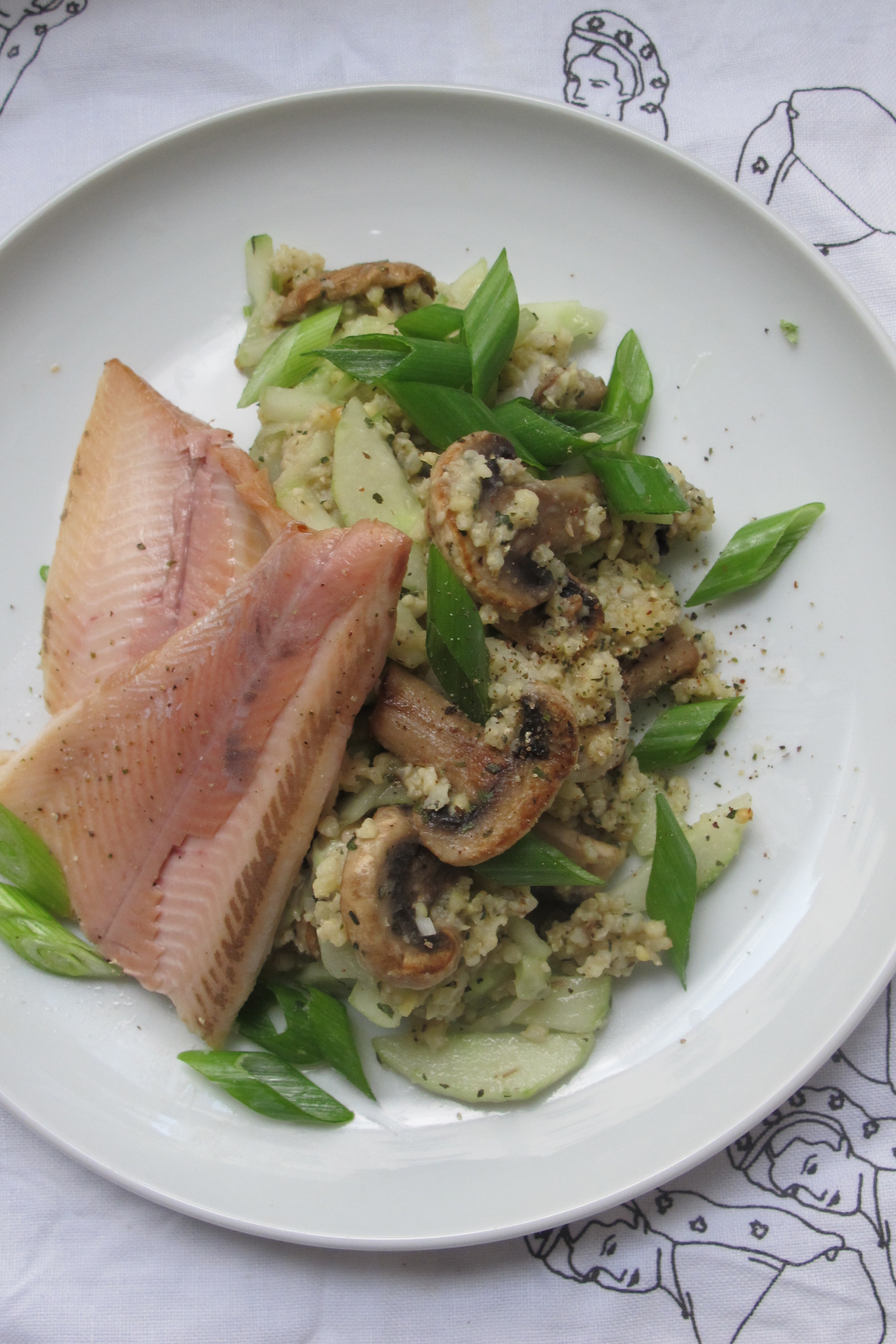 Hirsesalat mit Minze, gebratenen Champignons und geräucherter Forelle
