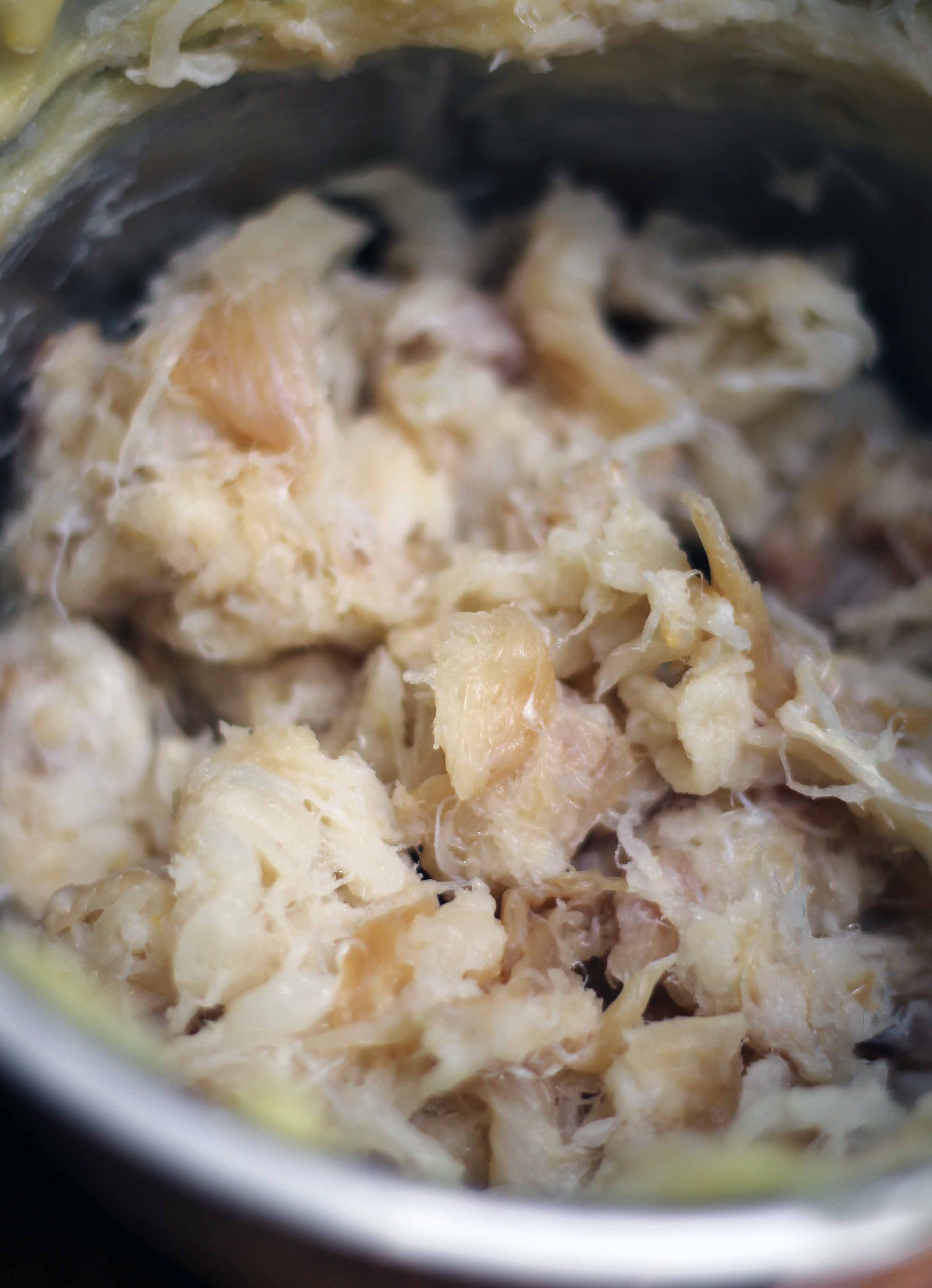 5. Stockfisch von der Haut abzupfen und in kleine Stücke zerpflücken, Gräten entfernen. Mit einem Pürierstab kurz grob durchmixen.
