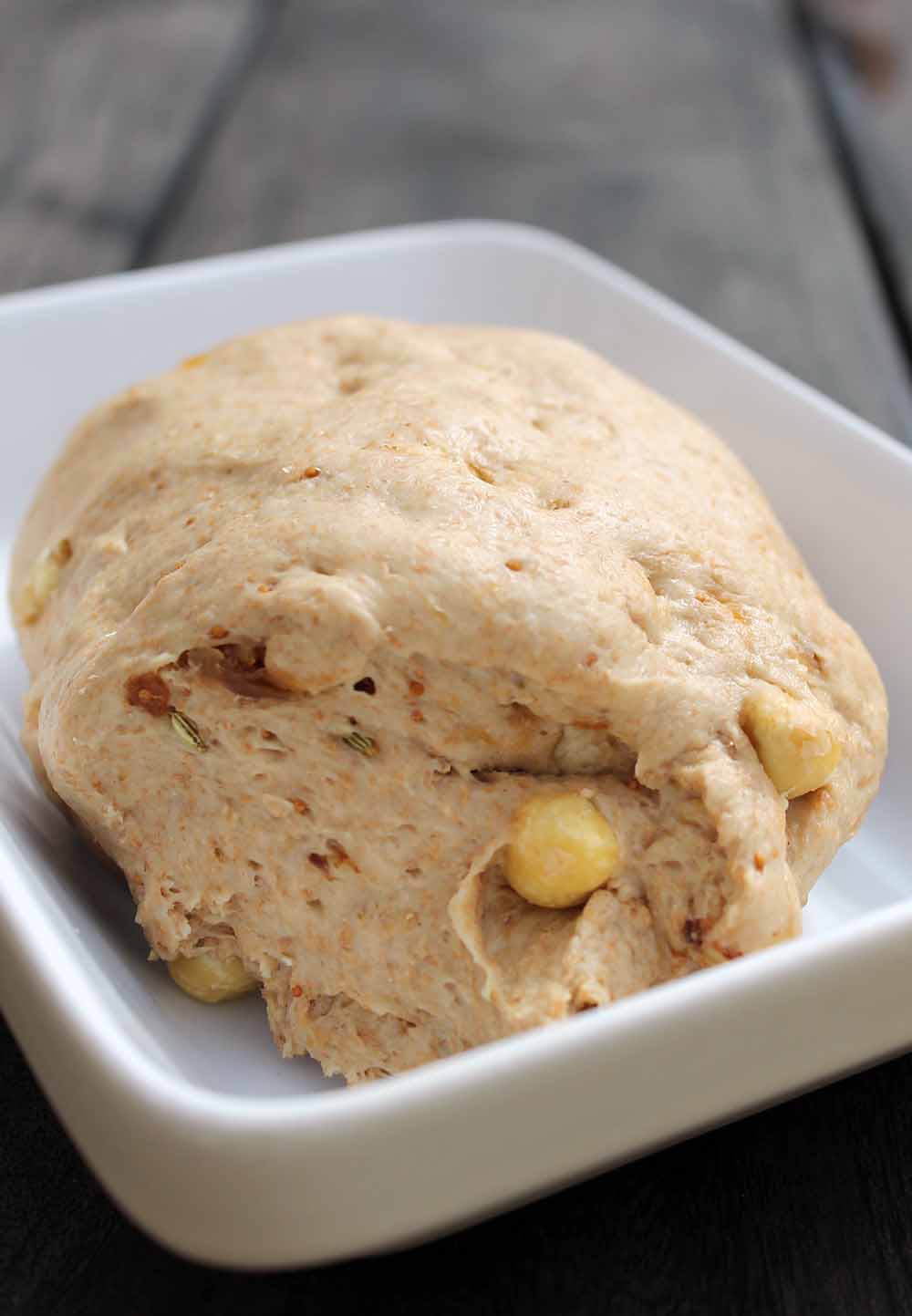 3. Mehl mit Olivenöl und Wasser mit den Knethacken verrühren, bis eine kompakte Teigkugel entsteht. Feigen und Haselnüsse unterrühren.