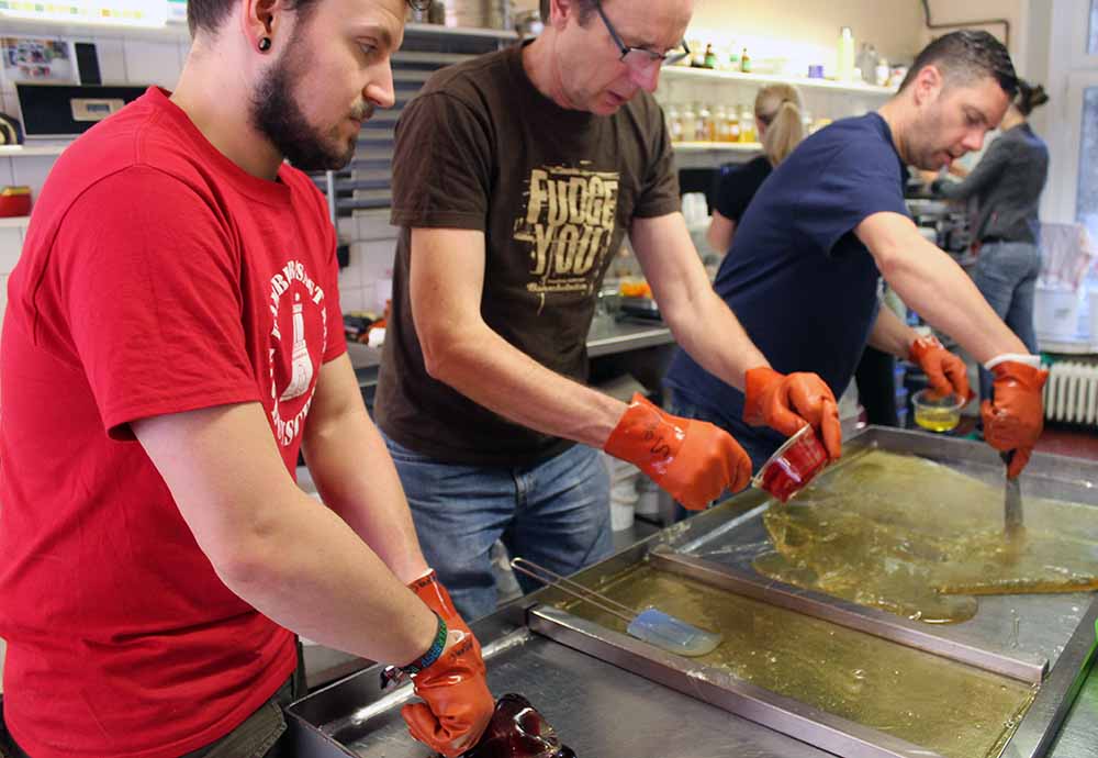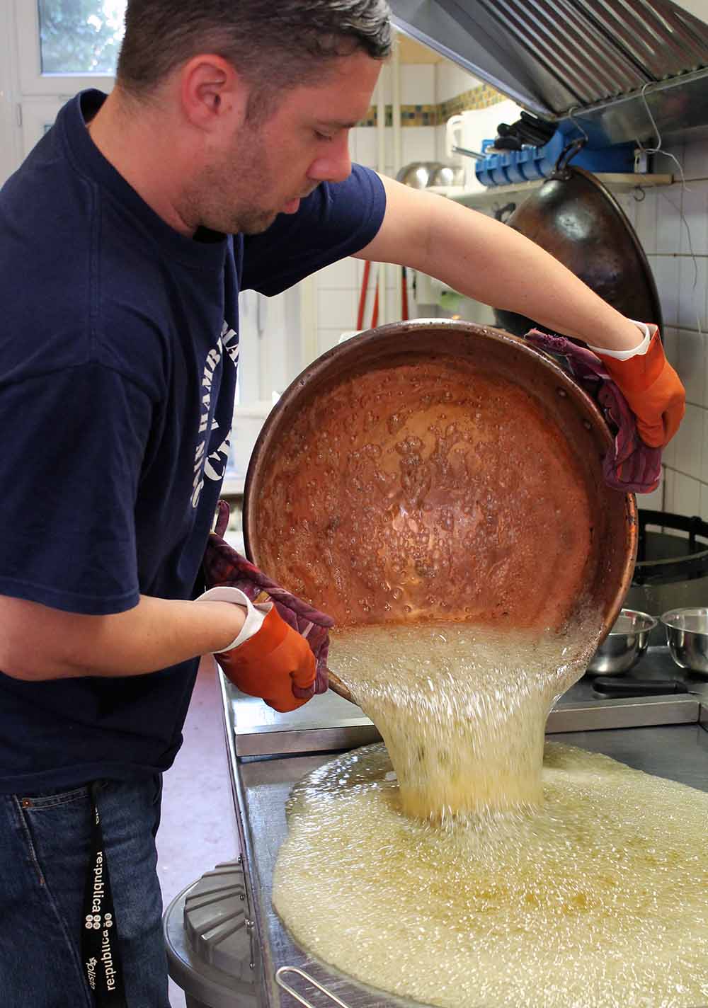 In einem Kupferkessel werden Zucker und Wasser erhitzt und die Masse durchs Kochen reduziert. Sobald die richtige Temperatur erreicht wird, kann Glukose dazu gegeben und mitgekocht werden, die hier übrigens aus einer Bio-Produktion stammt.