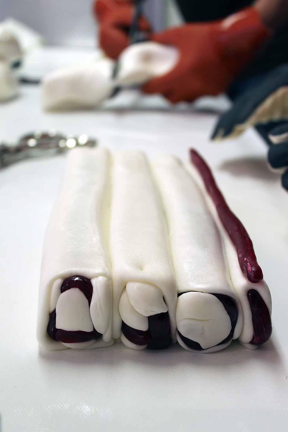 Wichtig dabei: Zucker muss in Bewegung bleiben und auf einer warmen Arbeitsfläche wird die eingefärbte Glukosemasse bearbeitet.