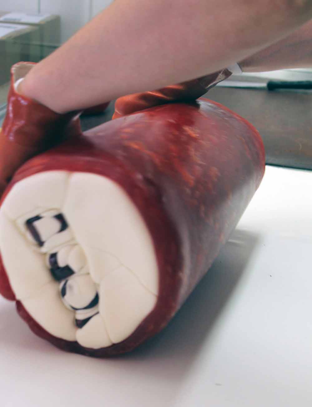 Alle Buchstaben werden einzeln in gleicher Größe geformt und zusammengesetzt. Die restliche Masse wird auf den Schriftzug Ahoi aufgesetzt. Ziel ist es, ein möglichst gleichförmiges, rundes Zuckerl, zu bekommen. Dafür muss die Masse ständig gerollt werden, damit die Masse weich und formbar bleibt.