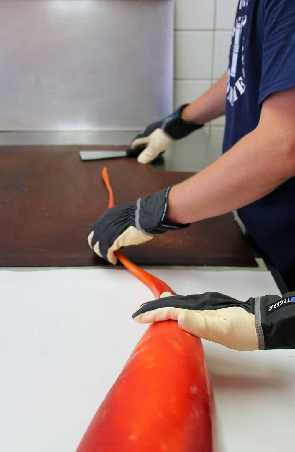 Von drei Mitarbeitern wird nun auf zwei reduziert. Während einer die Zuckerrolle in Bewegung hält, werden am Ende kleine Zuckerstangen geformt.