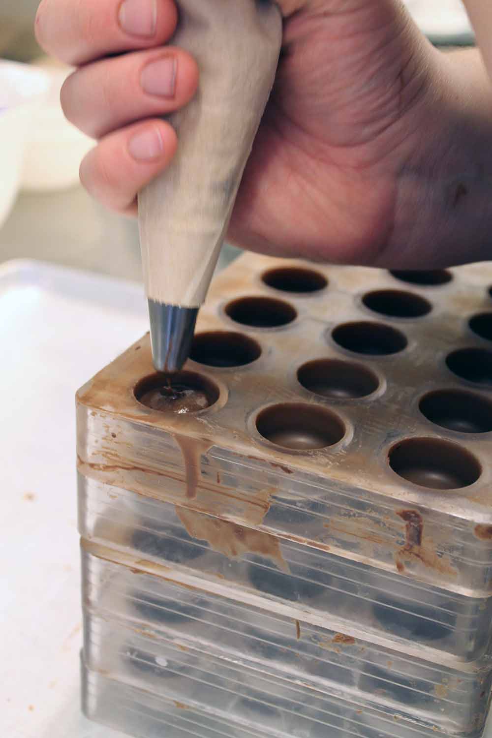 Kismet würde ich meinen, dass gerade Berits Vater ein „Nasch-Exil“-Österreicher in Hamburg ein ausgebildeter Konditor ist. Er verstärkt das Produktionsteam, das ansonsten noch aus Berit und Nicole besteht. Nicole, auch gelernte Konditorin, bewegt sich mit großer Begeisterung zwischen den Schokolademaschinen hin und her und fertig in Kleinmengen Pralinenhüllen an oder dressiert Cremen in die vorbereiteten Hüllen.
