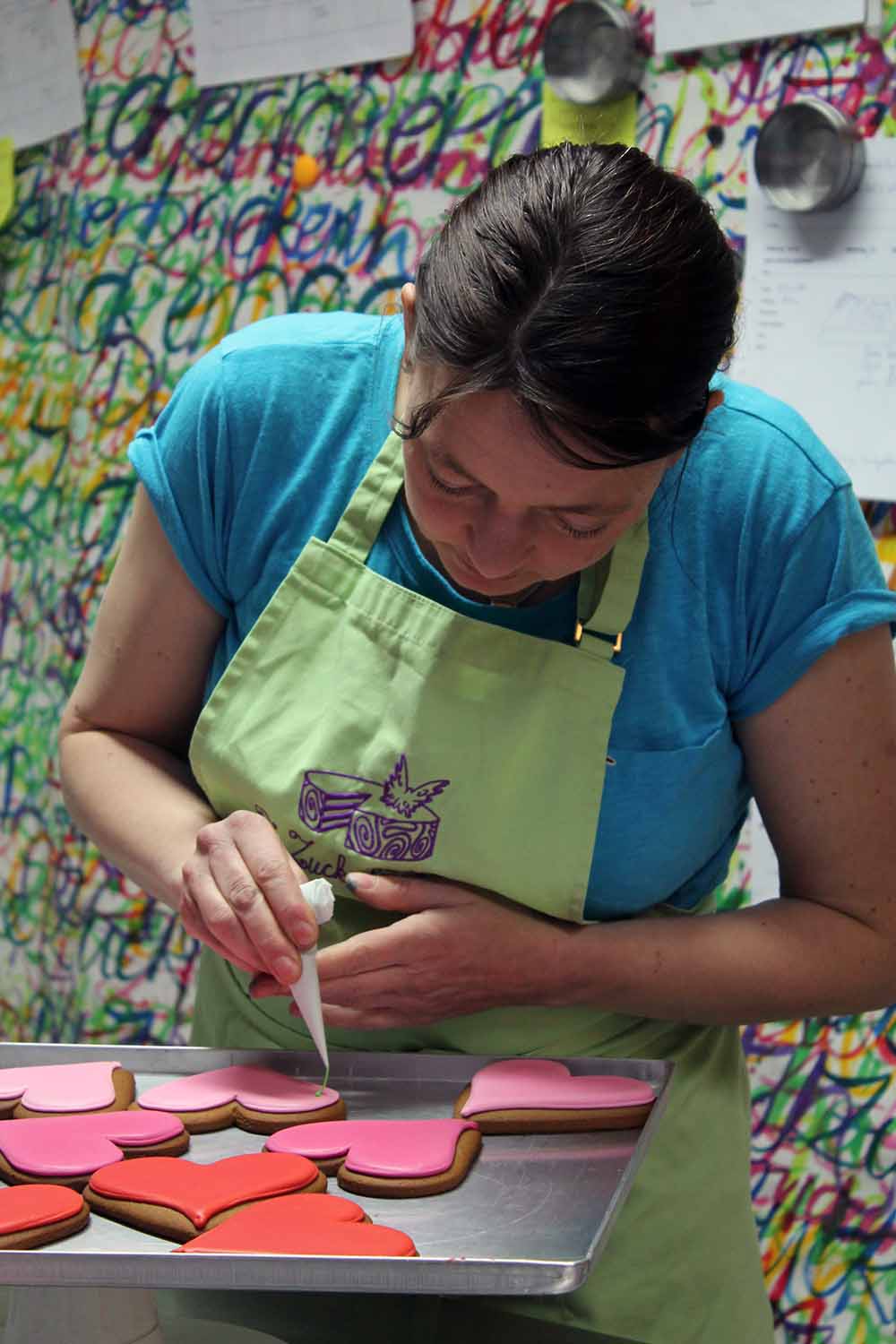 Christine hat mich mit ihren Fotos und Geschichten neugierig auf ihr Geschäft gemacht. Schaut euch selber die tollen Tortenfotos auf ihrer Facebook-Seite an (https://www.facebook.com/pages/Die-Zuckerb%C3%A4ckerin/272720426327?fref=ts). Da heute Montag die Produktion erst wieder fürs Wochenende begonnen hat, waren noch keine großen Teile zum Fotografieren da. Stattdessen haben wir ihre tollen Kekse gegessen und dabei Tacheles übers Kochgeschäft geredet.