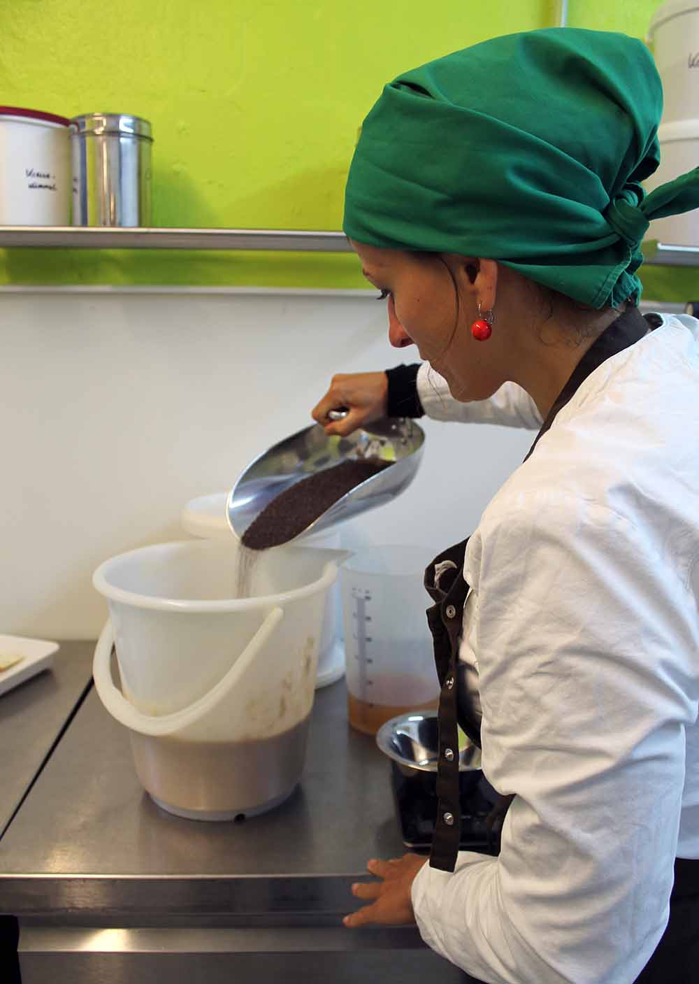 Ja, ich bin wirklich begeistert von den Beiden! Deshalb bin ich gleich noch ein zweites Mal zu ihnen geradelt und habe selbst Hand angelegt. Unter Evas Anleitung, habe ich meine eigene, limitierte Mischung produziert:  Biancas Mischung. 😉 Ein bisschen Koriander, Ingwer und Kreuzkümmel… mehr verrate ich nicht. Neugierig? Zum Verkosten muss man persönlich bei mir vorbei kommen, denn die limitierte Ware hat den Flug gut überstanden und lagert jetzt bei mir im Kühlschrank. 😉