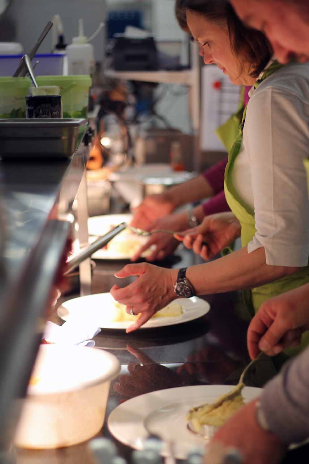 Alle Teilnehmerinnen werden aufgefordert, einfach direkt auch Fragen an die Küchenmannschaft zu stellen, um die Hürde zwischen Profis und Laien abzubauen. Anfänglich drücken sich die Teilnehmerinnen noch schüchtern durch die Küche, nur vereinzelt trauen sie sich in die Nähe der Profis. Erst nach ein bisschen Wein und Akklimatisierung in der Küche, scheint das Eis gebrochen zu sein. Am Ende des Abends sind alle vom Setting begeistert, dass man sozusagen „behind the scences“ blicken kann und wirklich mal sieht, wie die Profis kochen.