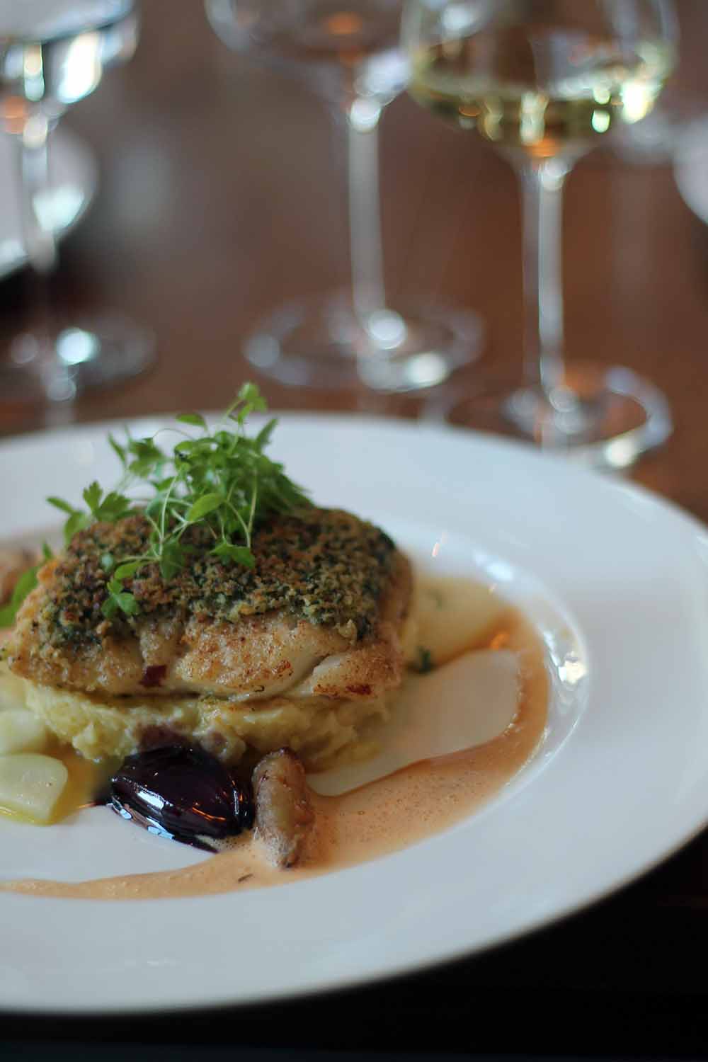 Kabeljau mit Pannfischkruste, Krustentierschaum, zweimal Schalotte, Linda Kartoffelstampf, Rübchen