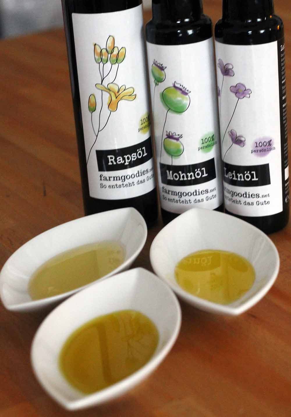 Das Öl, das zu Beginn mit dem selbst gebackenen Brot kredenzt wurde, konnte von den Gästen nicht identifiziert werden. Nussig im Geschmack und grün die Farbe. Vom hervorragend schmeckenden Rapsöl von farmgoodies.net haben sie offensichtlich nicht genug bekommen können, da sie bei den weiteren fünf Gängen zu ächzen begonnen haben.