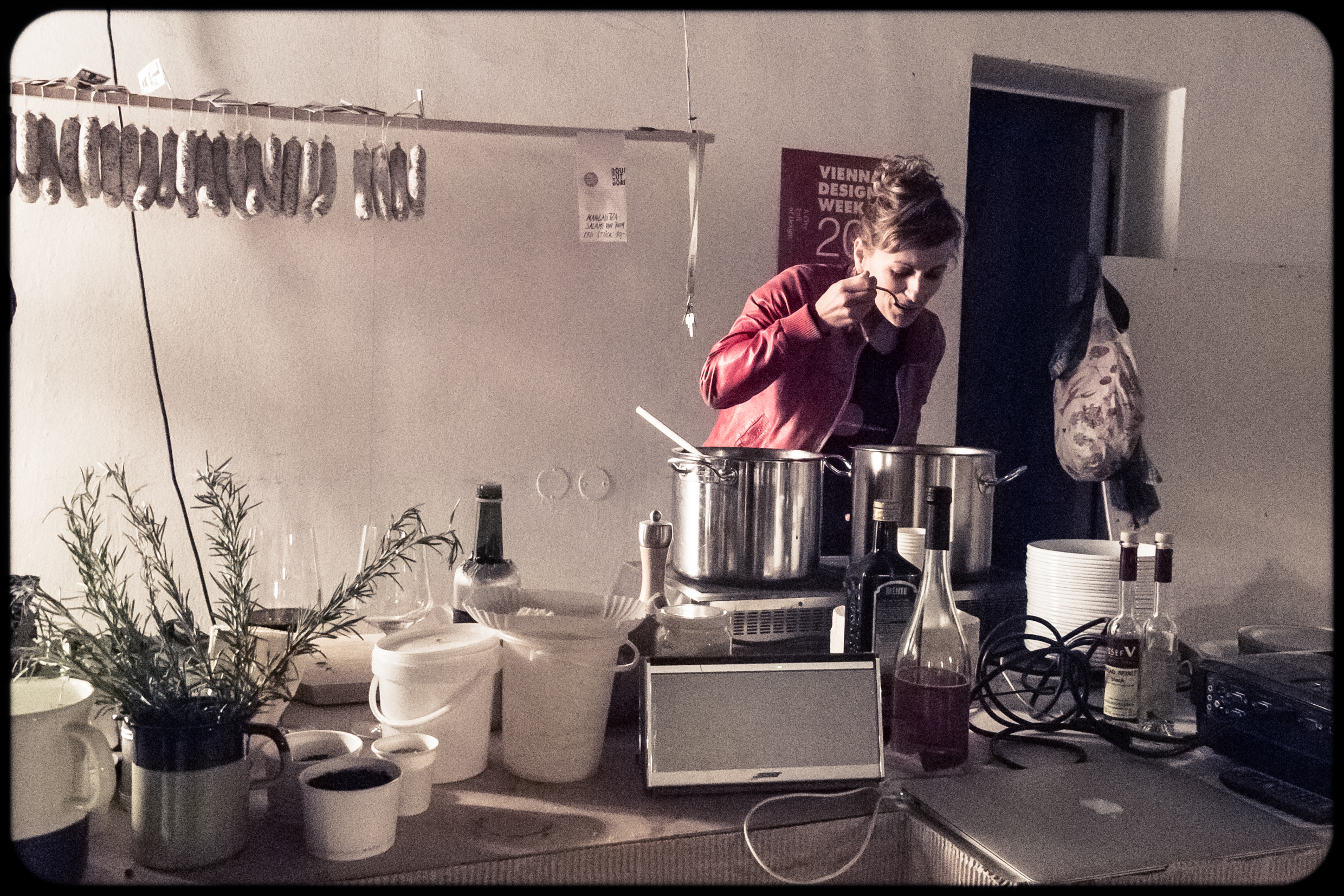 Jawohl, dem Wetter getrotzt! Mit Rettungsdecken und warmer Kleidung ausgestattet, wurde gestern Abend in der RoughCutHalle im 18. Bezirk aufgekocht, verkostet, ein bisschen gefroren und gelacht. Meine Nase führt noch immer eine Note vom Käsespetakel von Sarah Krobath, der Kopf erinnert sich wehmütig an die tollen roten Weine von Dorli Muhr und mein Magen schreibt noch den Thum-Schinken ab. Wer kennt das nicht?