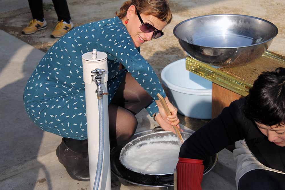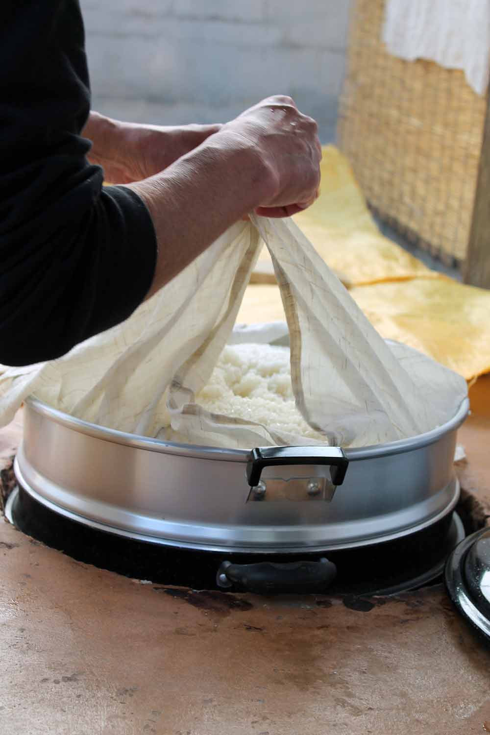 1. Schritt: Gemahlener Reis wird in heißem Wasser eingekocht
