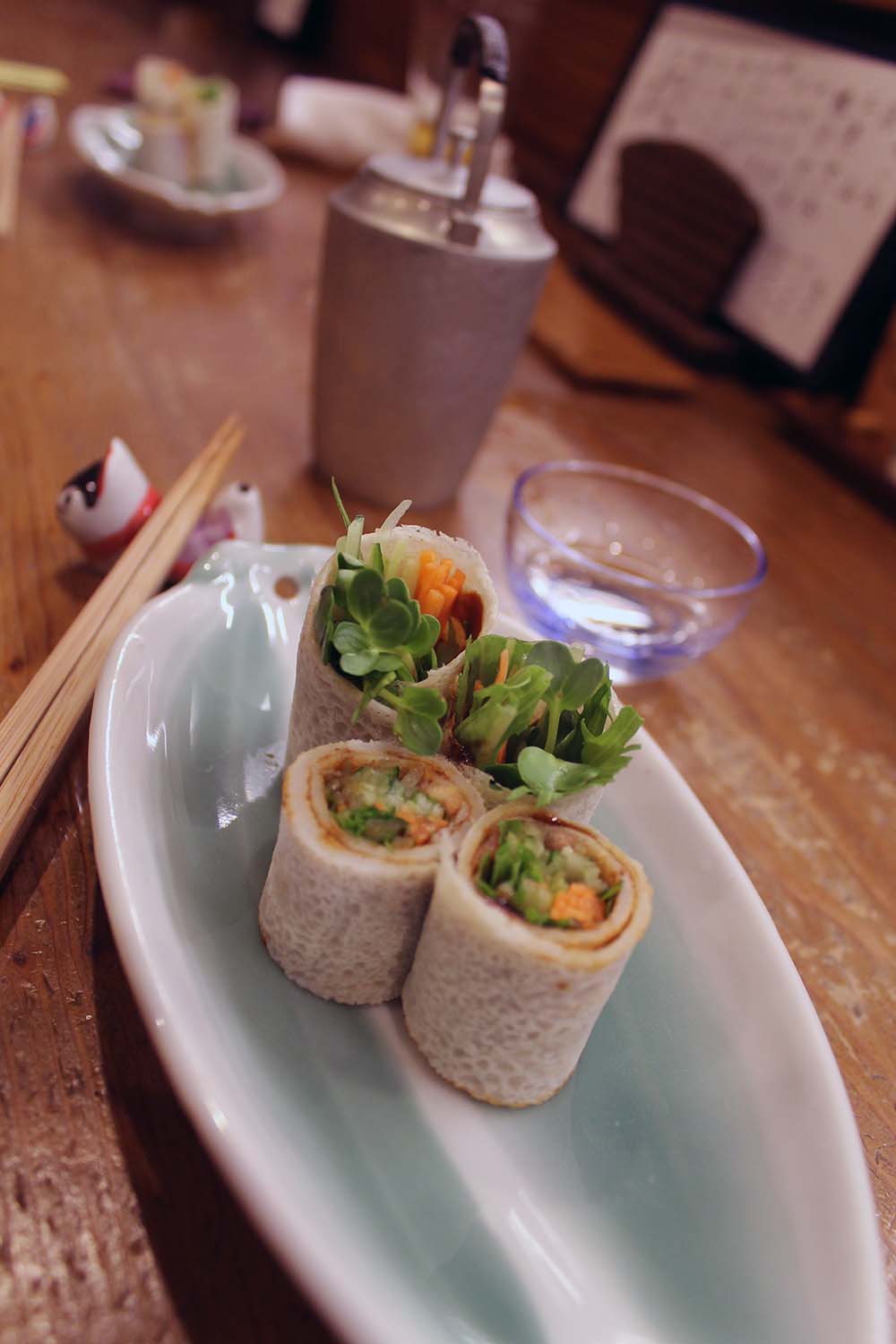 Meister Shimada ist jedoch kein Purist, sondern er führt im vorgegebenen Set-Menü über mehrere Gänge hin zum Hauptgang: kalten Soba. Buchweizen, erklärt er nebenbei, ist ein völlig anspruchsloses Korn, das auch auf kargen Böden wächst.