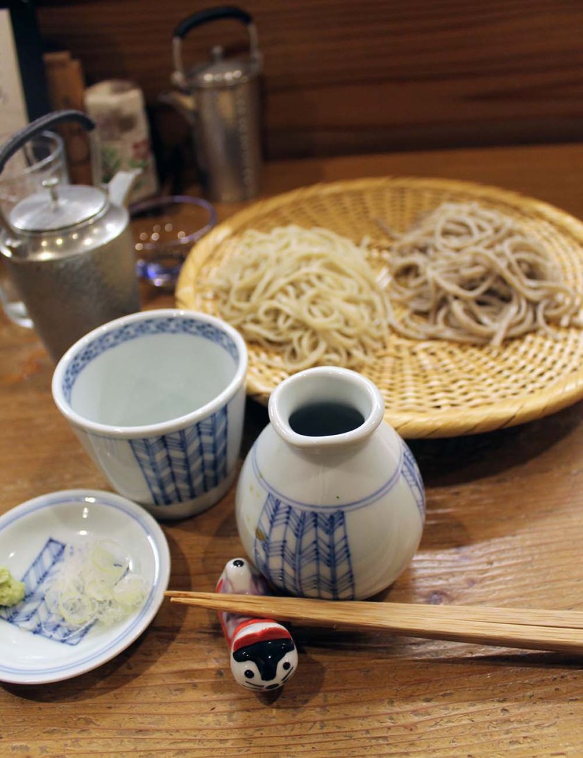 Ich kann mich erinnern, dass ich 1998 erstmals mit Soba in Kontakt gekommen bin. Ryota, mein japanischer Studienkollege, erklärte mir wie man diese kalten Nudeln schlürft und auch, dass sie ein beliebter Snack für die Japaner sind, da der Nährwert hoch und der Preis niedrig ist. Die traditionelle Sauce Kake Soba besteht aus einer Brühe (Dashi), Reiswein und Sojasoße. Meistens wird die Sauce noch mit frisch geriebenem Ingwer, Wasabi und fein geschnittener Frühlingszwiebel serviert (siehe Foto). Je lauter geschlürft, desto besser!