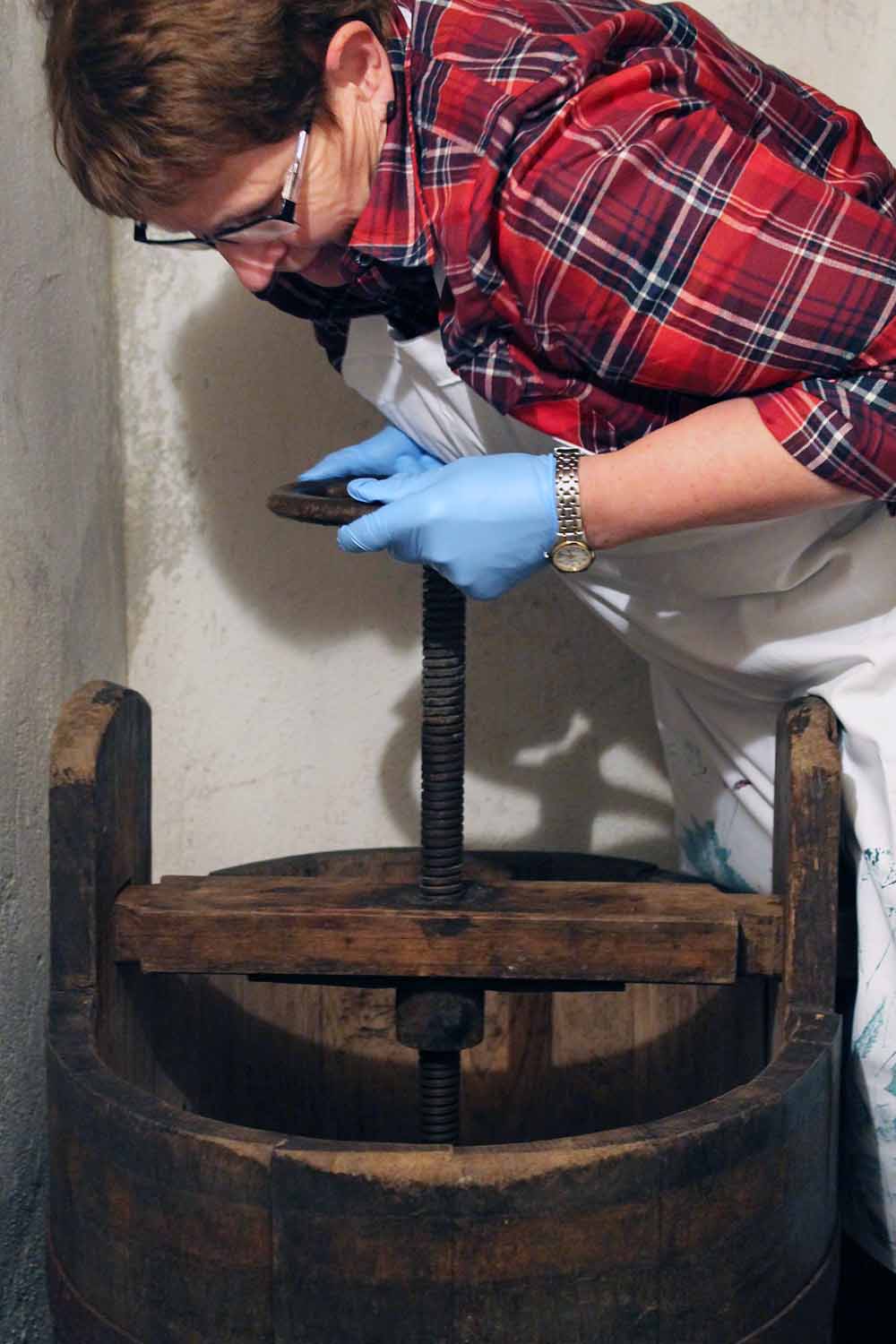 Seitdem das Fleisch im Sur-Schaffel im Keller geschichtet wurde, hat das Fleisch aufgrund der Salz-Sur Wasser und Masse gelassen und meine Mama daher den Druck immer leicht erhöht. Nach drei Wochen wurde das Schaffel geöffnet.