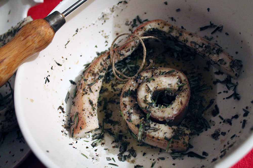 Da der Lardo mit dem restlichen Speck in den Selchschrank kommt und muss jedes Stück mit einem Faden Spagat aufgefädelt werden.