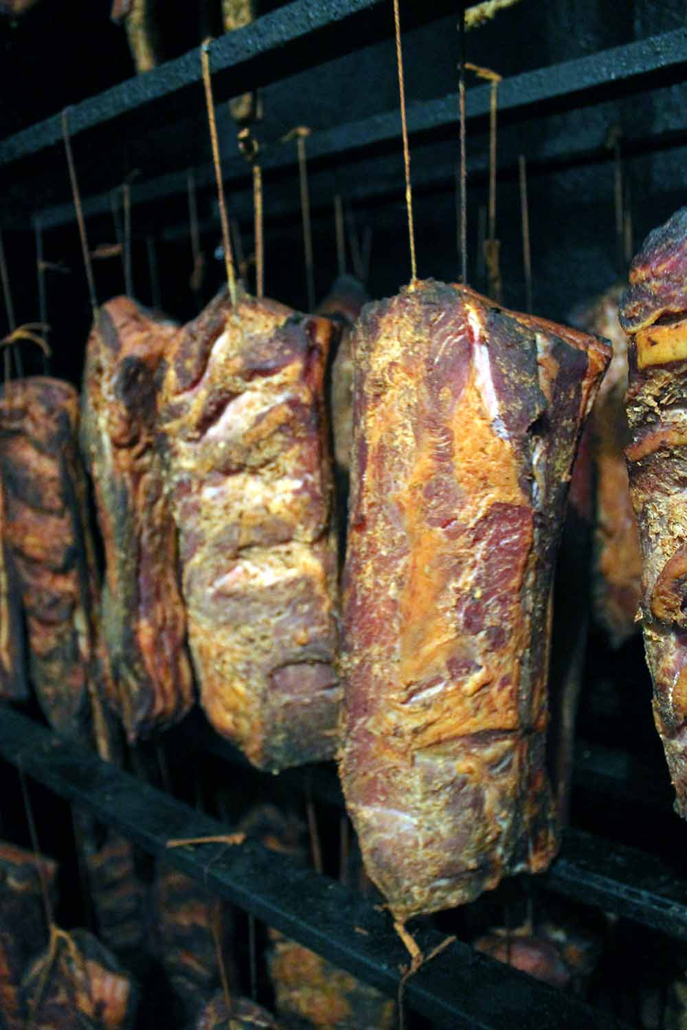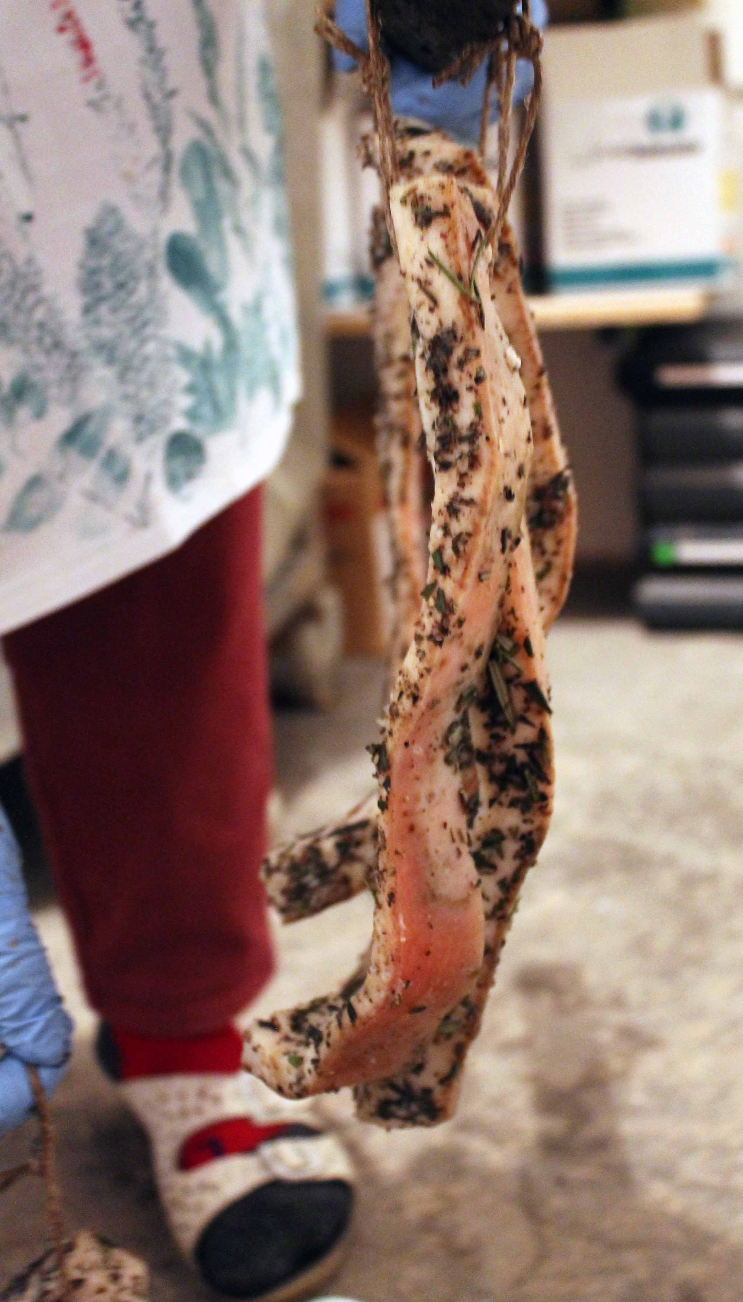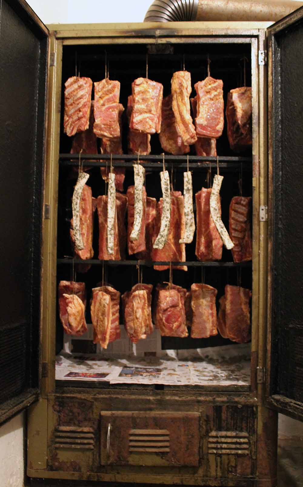 Zuerst muss das Fleisch nach einer bestimmten Systematik aufgehängt werden. Denn die kleineren Stücke, wie z.B. Bauch und Lardo haben bereits nach 2 Wochen das optimale Selchstadium erreicht.
