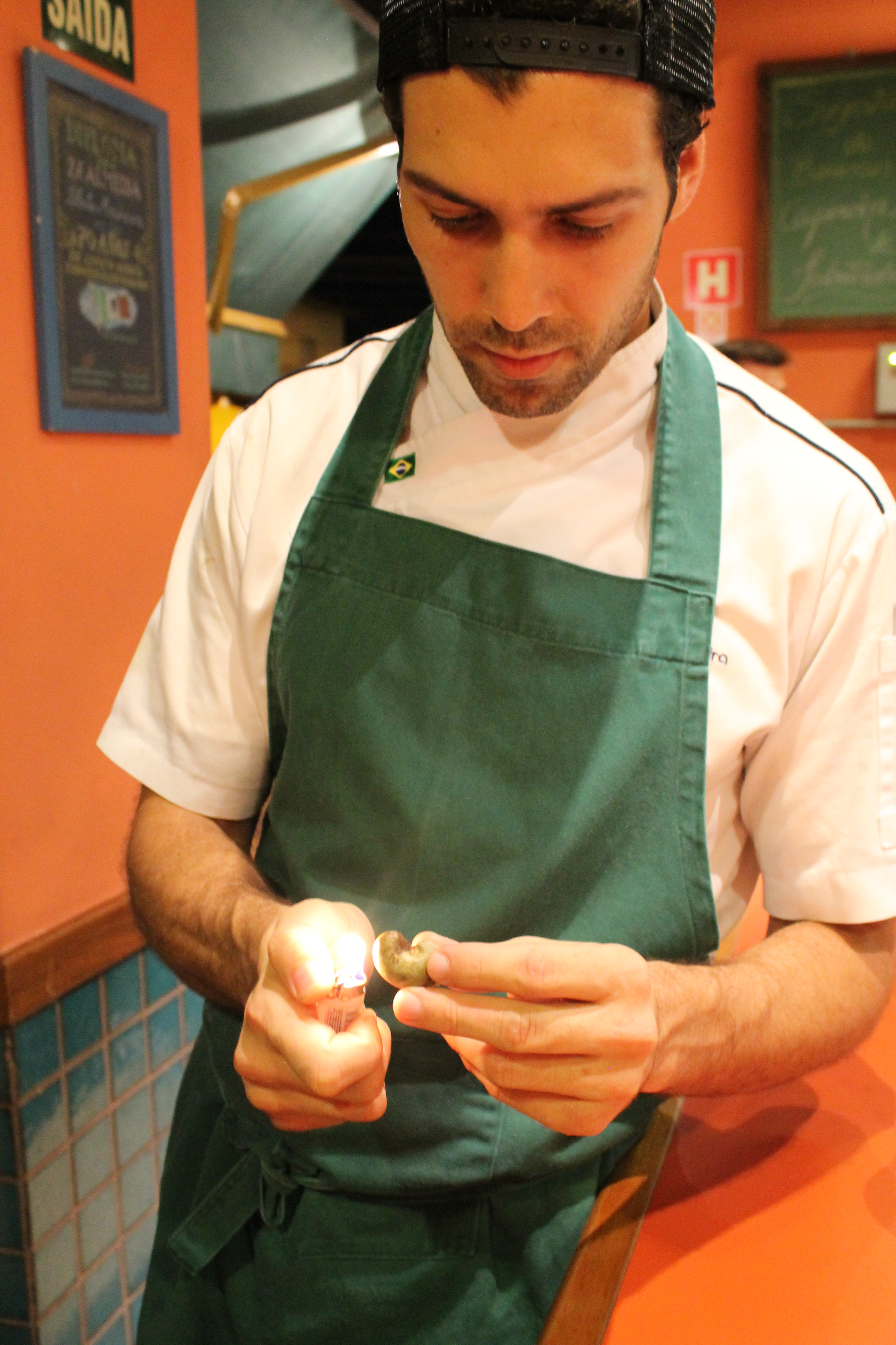 Rodrigo Oliveira vom Mocotó versucht eine Cashew-Nuss zu öffnen