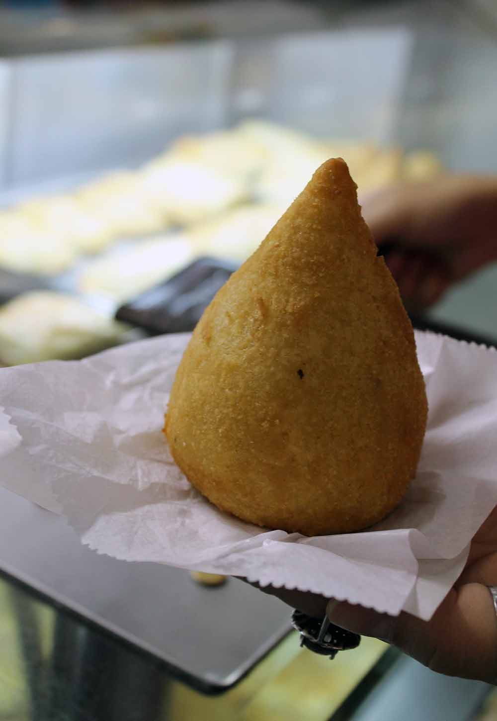 Aber auch „C“ für diesen kleinen Teigkegel, den es als Snack im ganzen Land zu kaufen gibt. Er wird Coxinha (sprich „Ko-tschi-na“) genannt und mit zerfledertem Hühnerfleisch gefüllt.