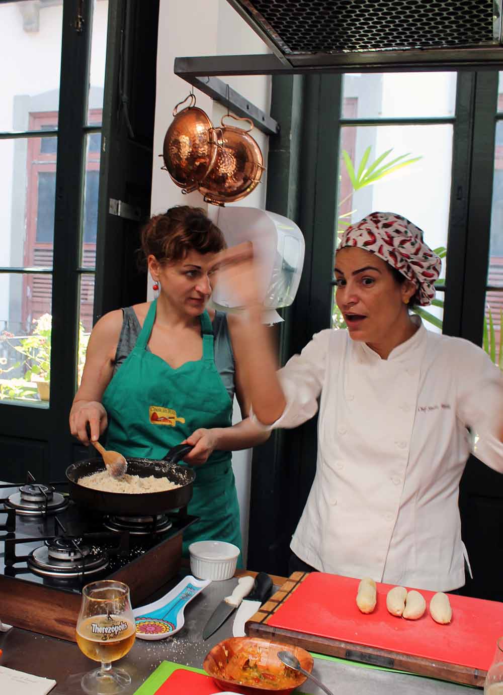 Ein großes Mysterium ist und bleibt „F“ für Farova für mich, das ich hier sehr skeptisch mit Banane unter Anleitung von Chef Denise bei „Cook in Rio“ zubereite. An trockene Semmelbrösel erinnernd, wird das Maniok-Mehl mit Fett und diversen Zutaten zubereitet und zu sprichwörtlich jedem Gericht serviert. Ich selbst habe erst in Belem bei einem Gericht von Thiago Castanho – dem Jung-Kochstar aus dem Amazonas – begonnen, Farova ansatzweise zu verstehen.