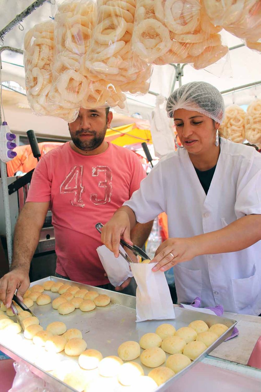 „P“ steht in Brasilien für „Pão de queijo“ (sprich „Pau de Kä-schu“) und ist das leicht säuerliche Frühstück- oder Kaffeegebäck, das traditionell mit der Stärke von Maniok hergestellt wird – und mit Käse gefüllt wird. Lauwarm serviert oder frisch aus dem Backofen – wie hier am Sonntagsmarkt in Manaus -, eignet sich diese blasse Teigkugel ideal zur Deckung jeglichen Energielochs am Nachmittag.