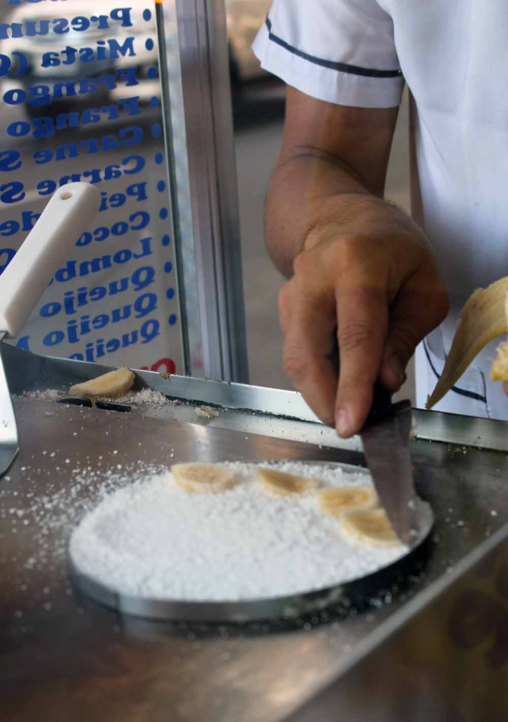 „T“ steht für Tapioka, einem Nebenprodukt bei der Maniok-Erzeugung, das es in unterschiedlichen Verarbeitungsformen zu kaufen gibt. Hier wird im Zentrum von Rio de Janeiro eine Tapioka-Crêpes gefüllt mit Banane, Doce de Leite und Zimt für mich hergestellt. Man gönnt sich ja sonst nichts.