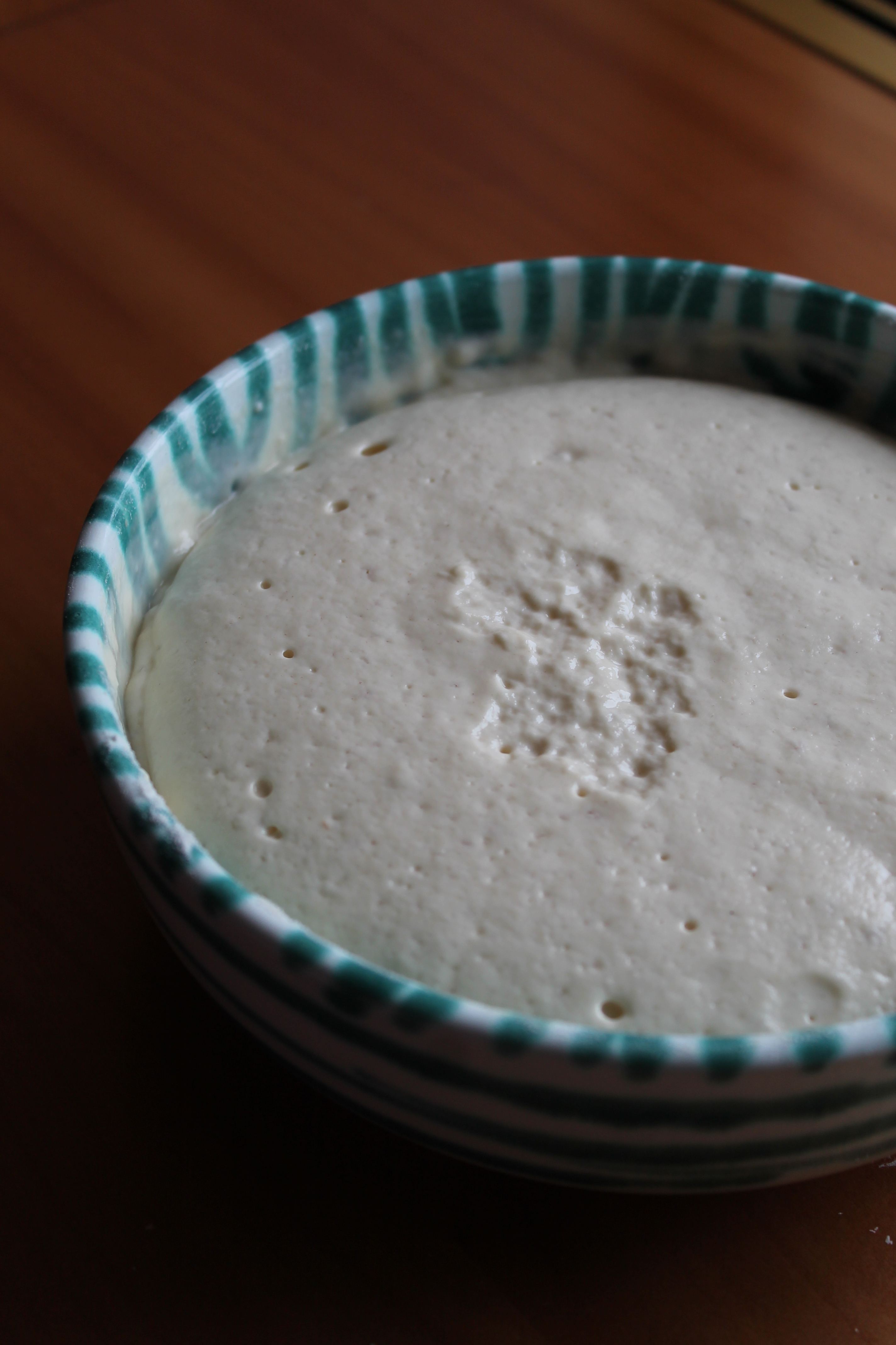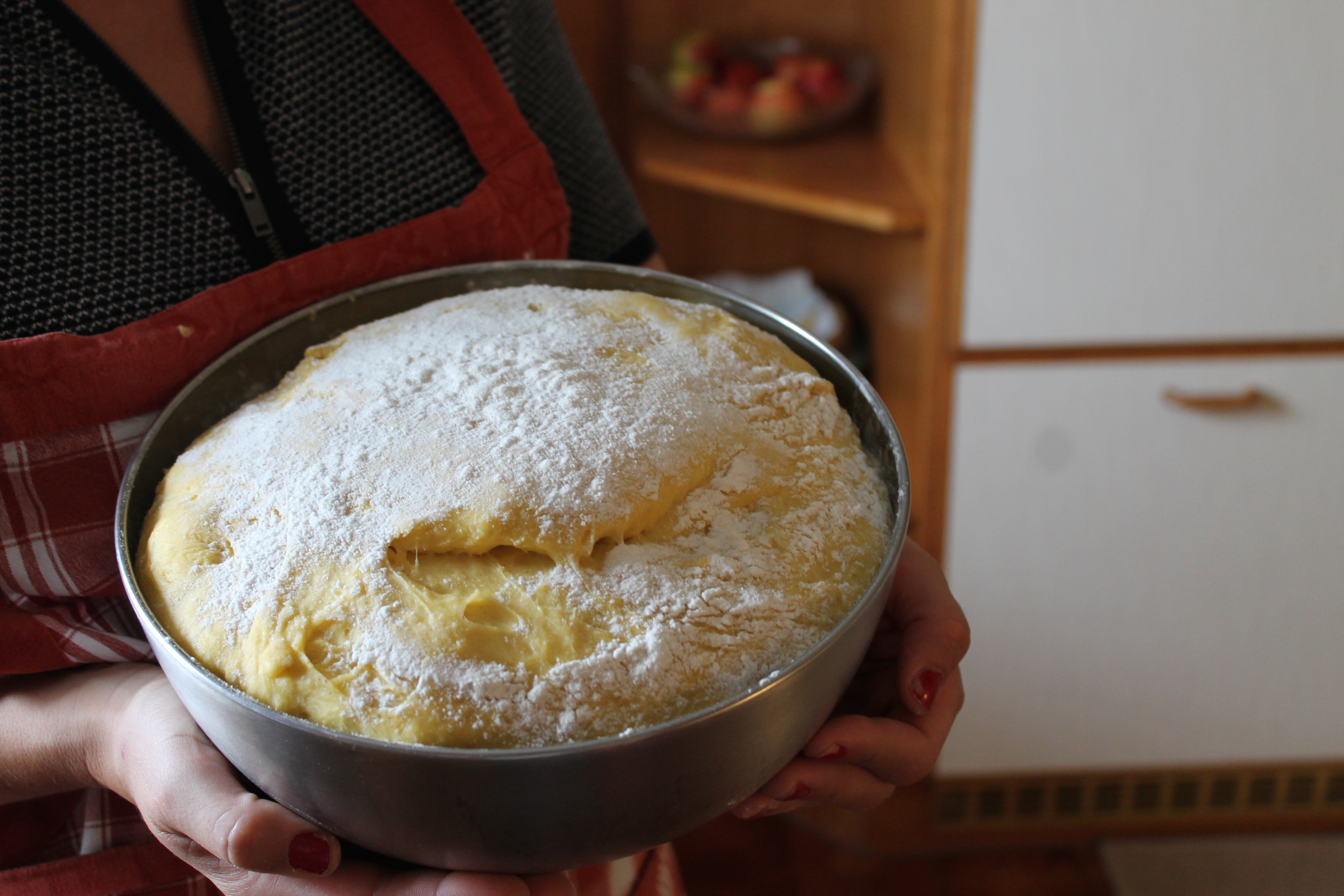 - Den Teig mit Mehl bestauben und mit einem Geschirrtuch abgedeckt in einer Rührschüssel an einem warmen Ort gehen lassen. Nach einer Stunden zusammenschlagen und nochmals durchkneten, nochmals gehen lassen. Nochmals schlagen und nochmals gehen lassen.