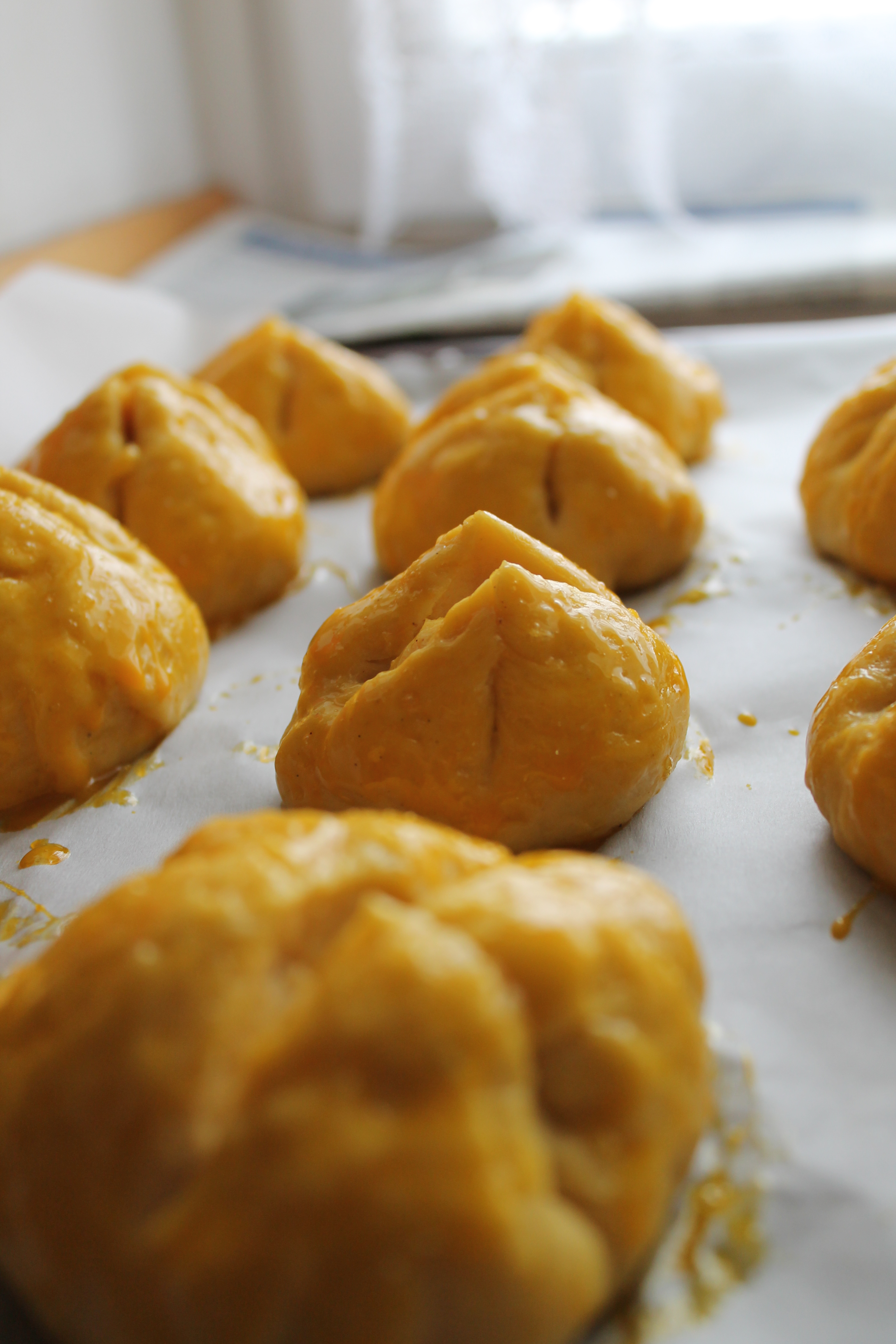 - Aus dem Teig ca. 15 gleich große Kugeln formen und auf ein mit Backpapier setzen und mit zerschlagenen Eidottern bestreichen und ca. 30 Minuten gehen lassen.