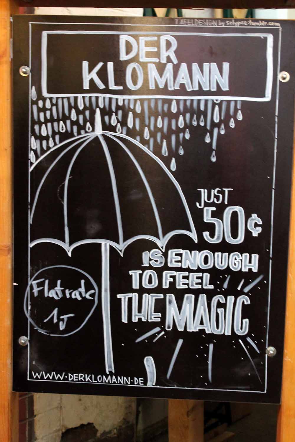 Am Klo hier stinkt es nicht! „Der Klomann“ ist geschäftstüchtig und bietet nicht nur eine „Flat-Gebühr“ für Besucher der Markthalle IX an, sondern hat auch eine eigene Homepage. Die Flatgebühr richtet sich an alle Besucher, die mehr als zwei Mal pro Abend das stille Örtchen besuchen müssen.