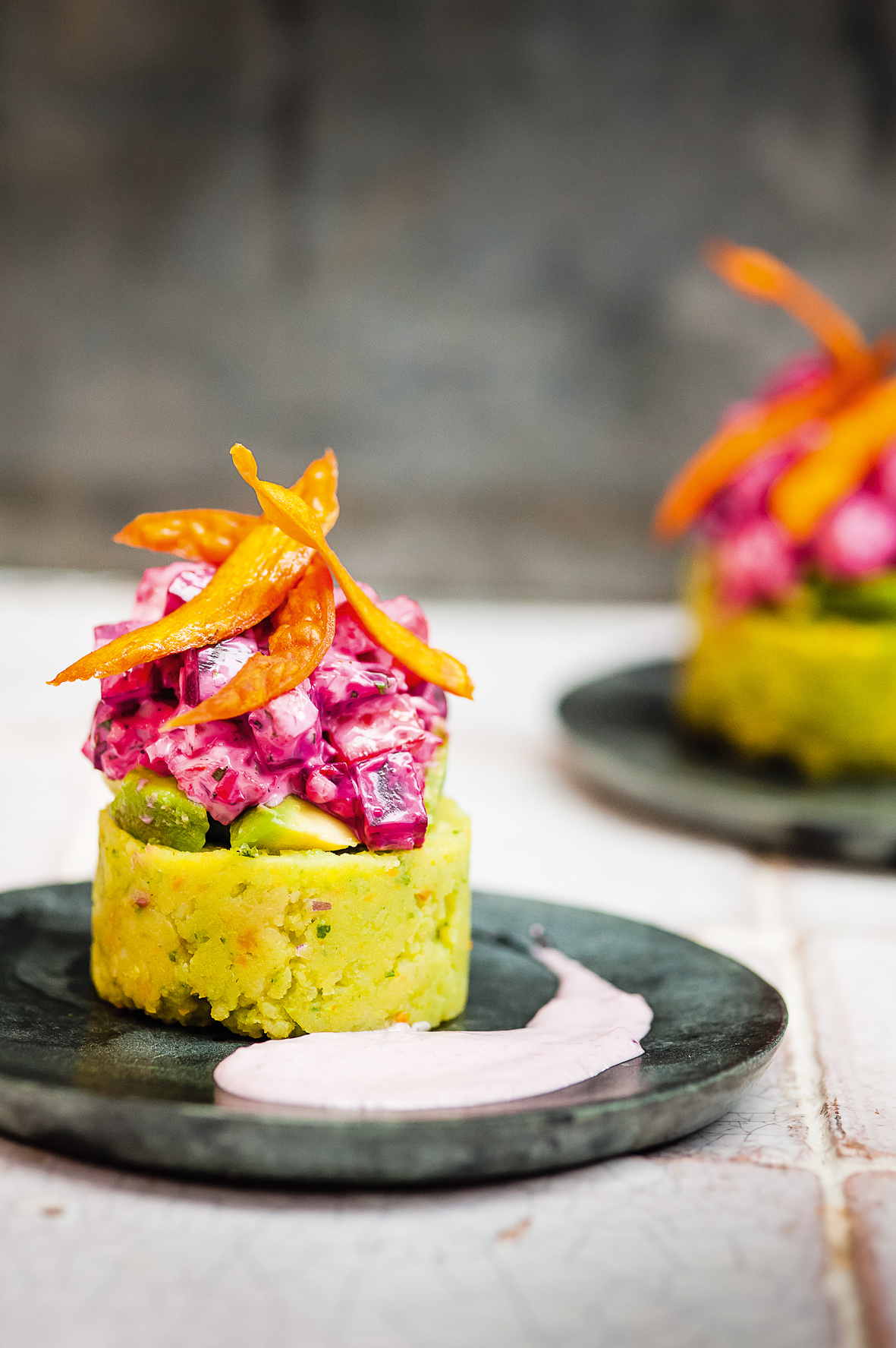 Ein Salat, der es mir allerdings besonders angetan hat ist „Causa Santa Rosa„. Dabei handelt es sich um einen Koriander-Kartoffel-Kuchen mit Roten Rüben, Karotten und Avocado.