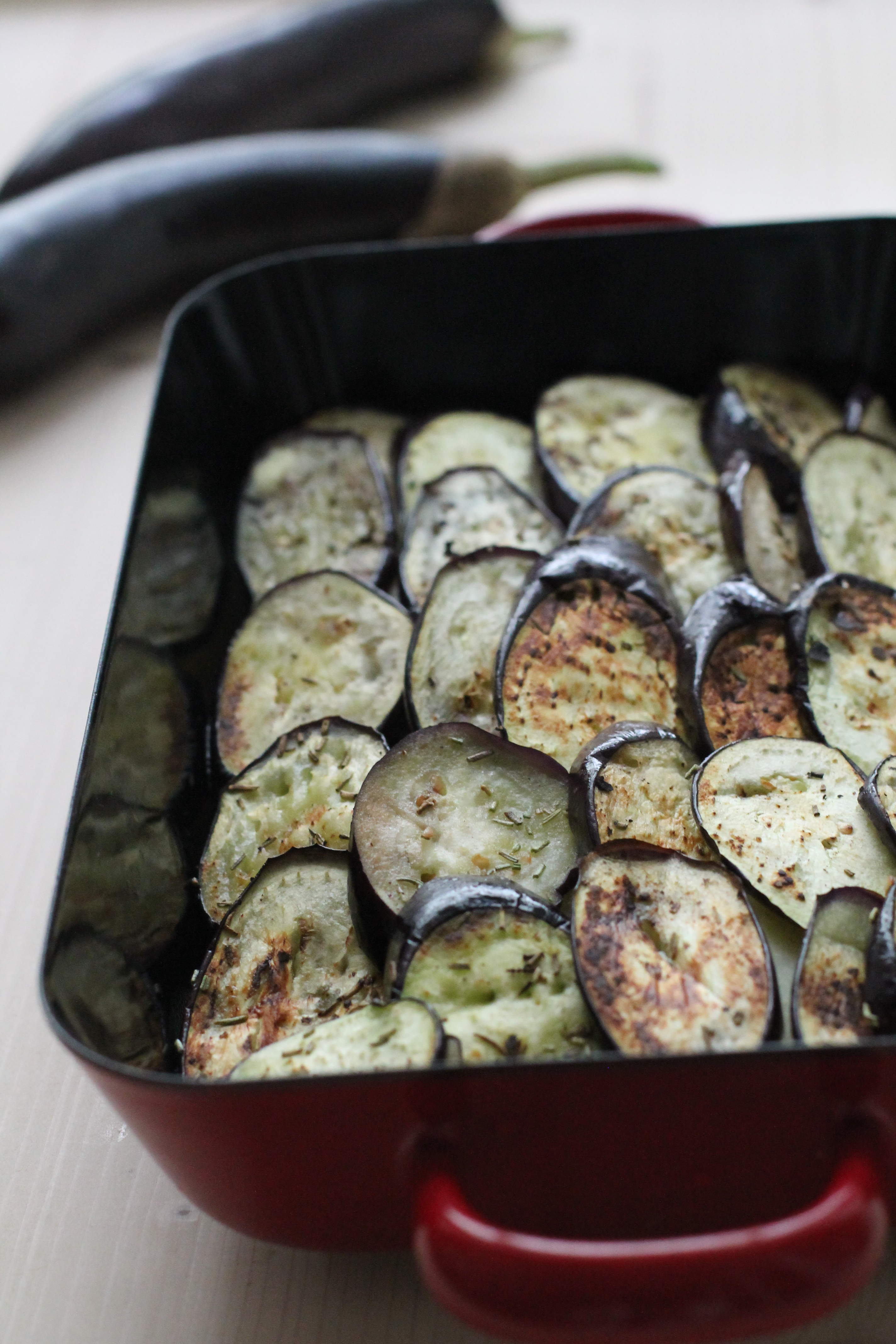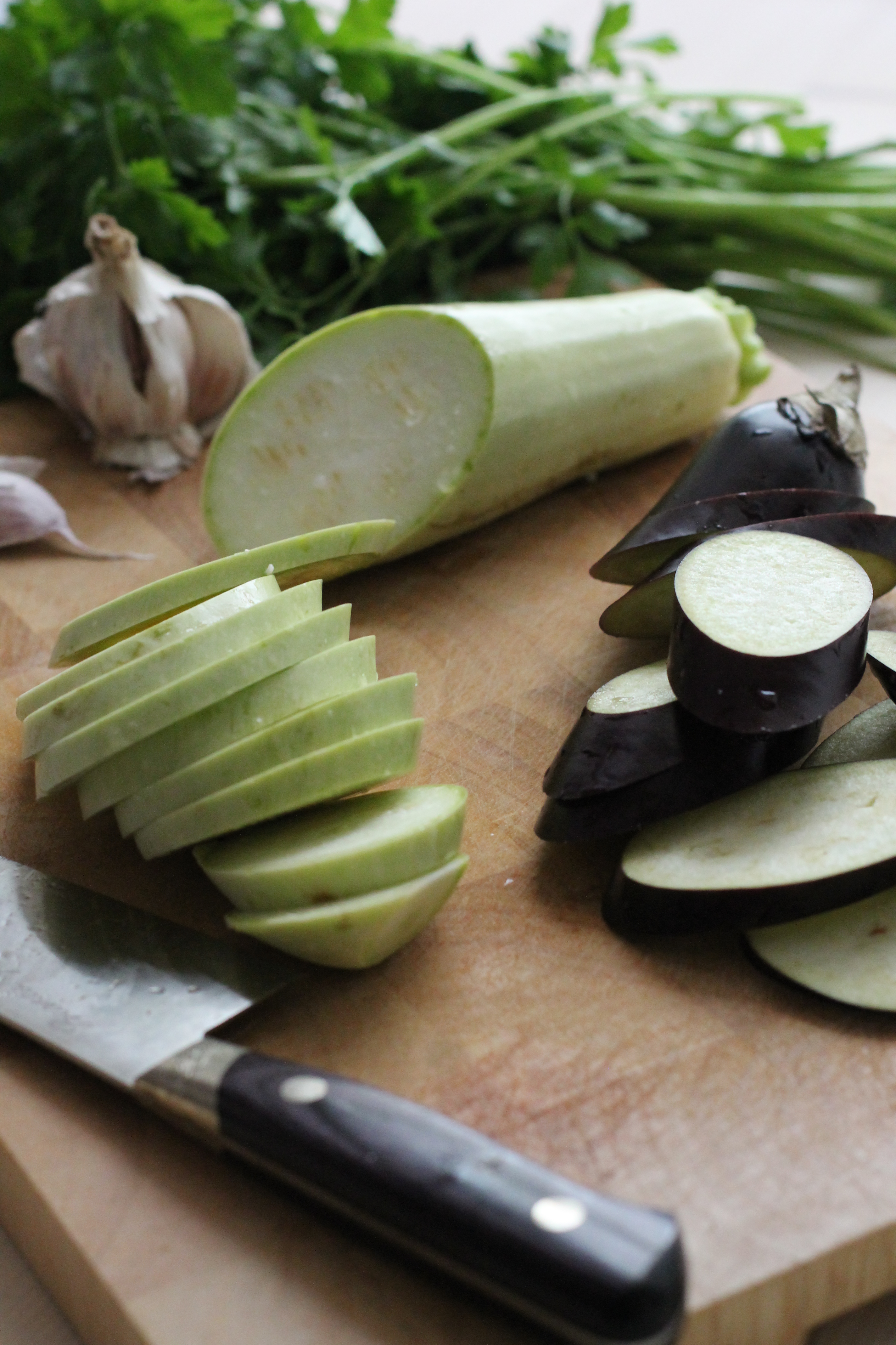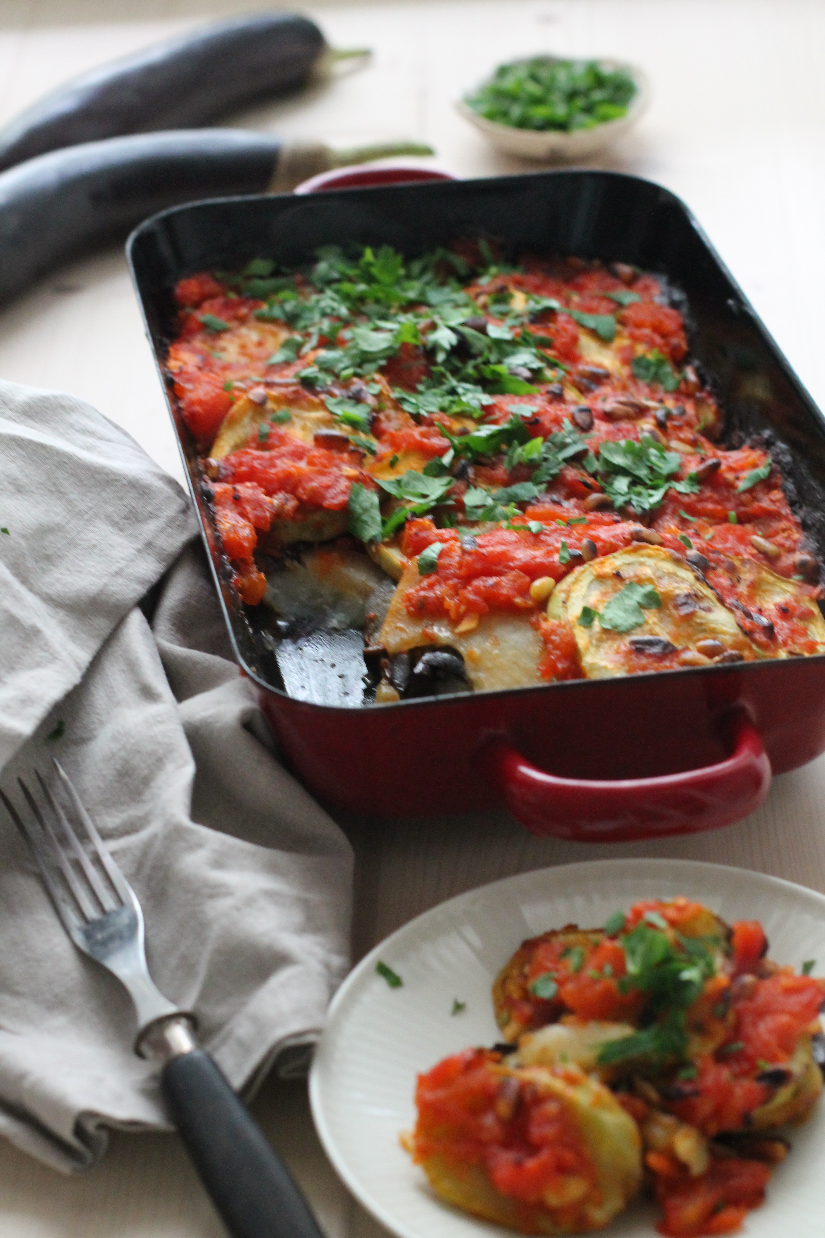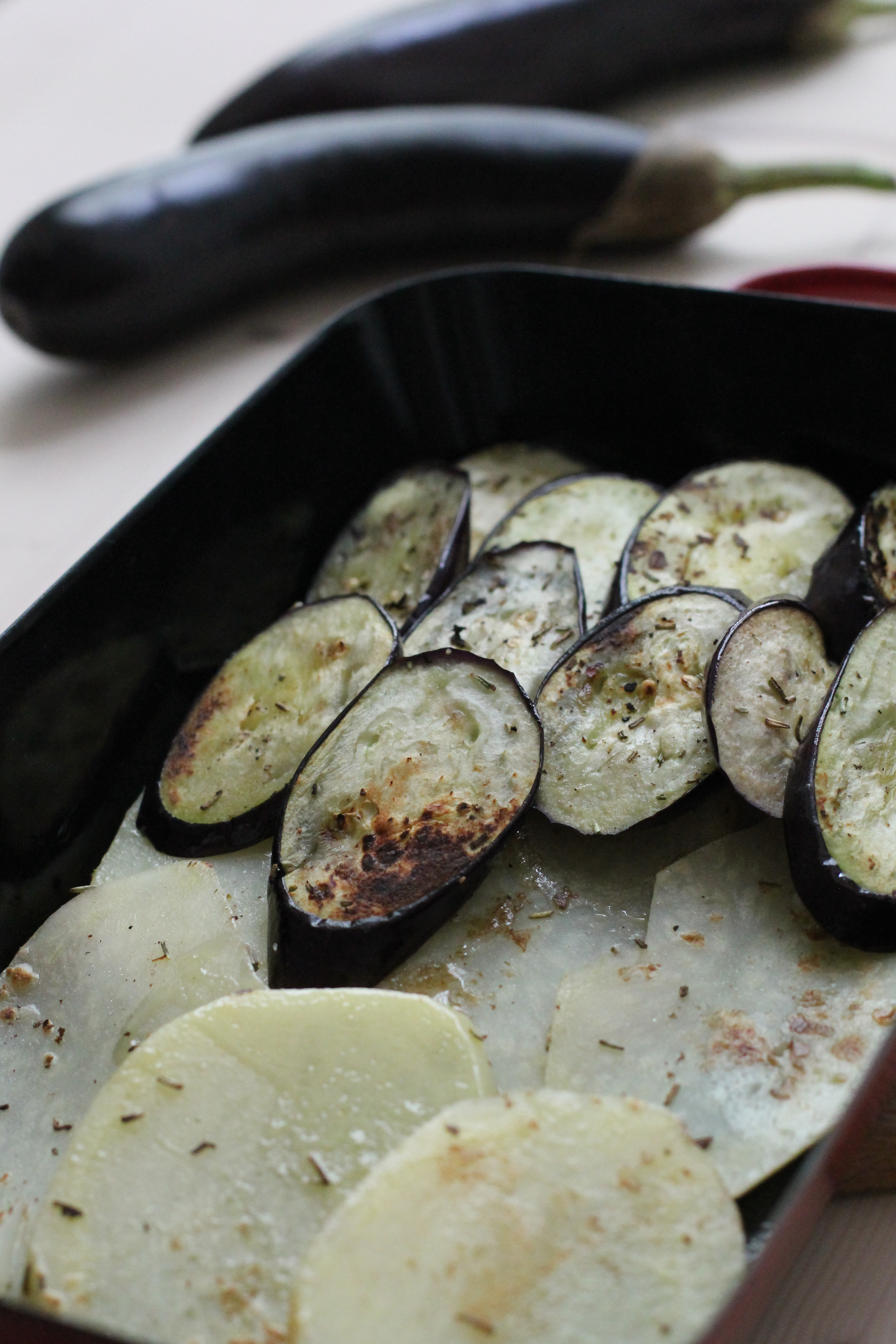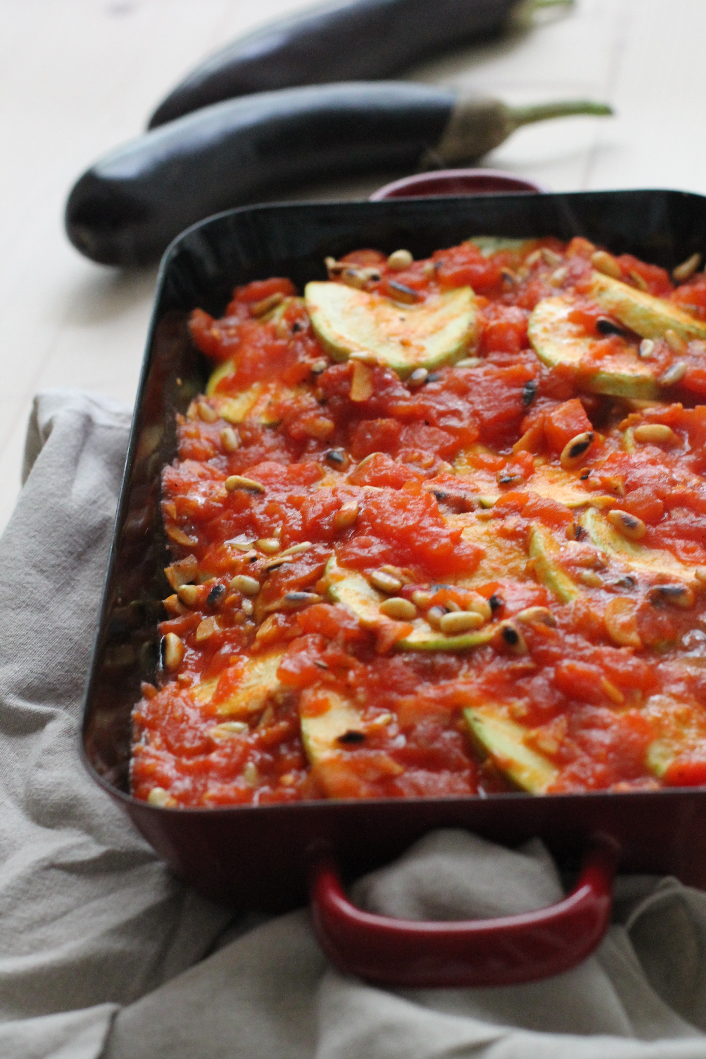 4. In einer heißen Pfanne das Gemüse kurz anbraten und in einer Auflaufform das Gemüse in der folgenden Reihenfolge schichten: Erdäpfeln, Melanzani, Zucchini, um sie abschließend mit der Paradeisersauce zu bedecken.