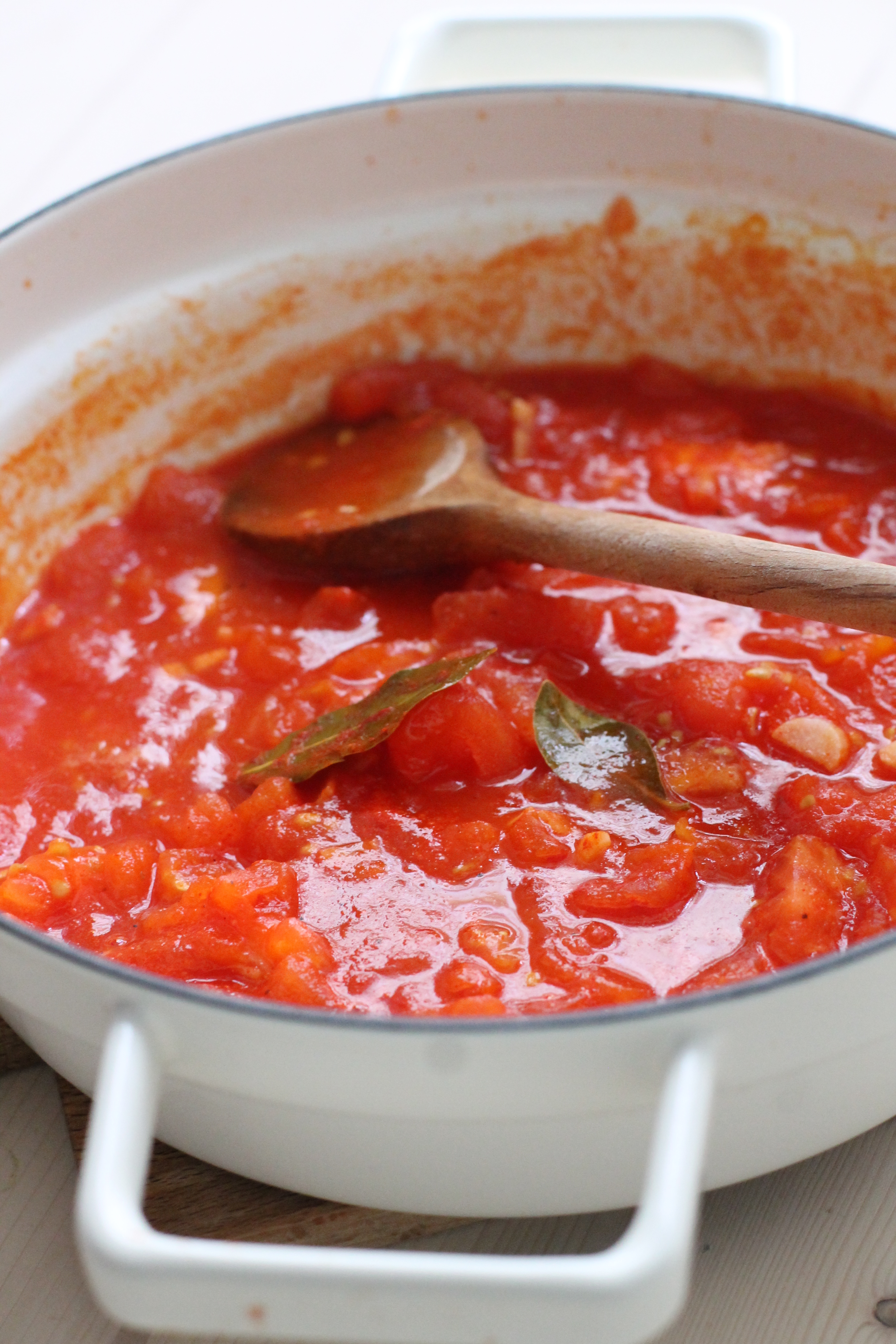 2. Geschälte und gehackte Paradeiser, Lorbeerblätter, 1 EL Tomatenmark und 1/2 TL Salz dazu geben und ohne Deckel für 20-30 Minuten köcheln lassen. Mit etwas abgeriebener Zitronenschale abschmecken.