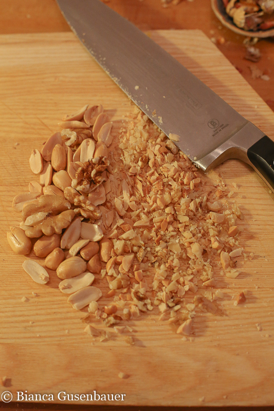 • Geschälten Haselnüsse, Walnüsse und Rosinen fein hacken. Je feiner, desto besser.