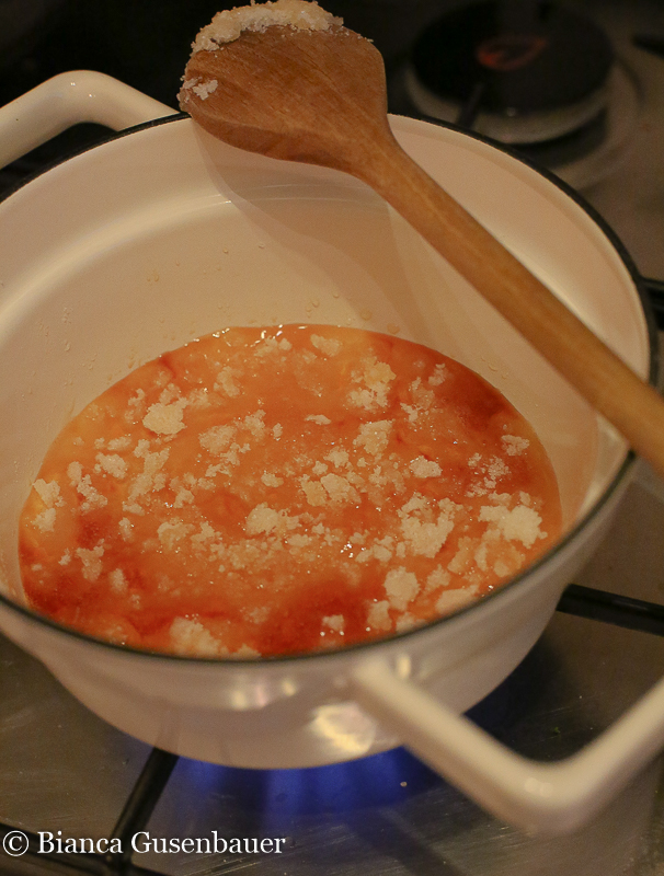 • Kristallzucker in einer Pfanne schmelzen und karamellisieren.
