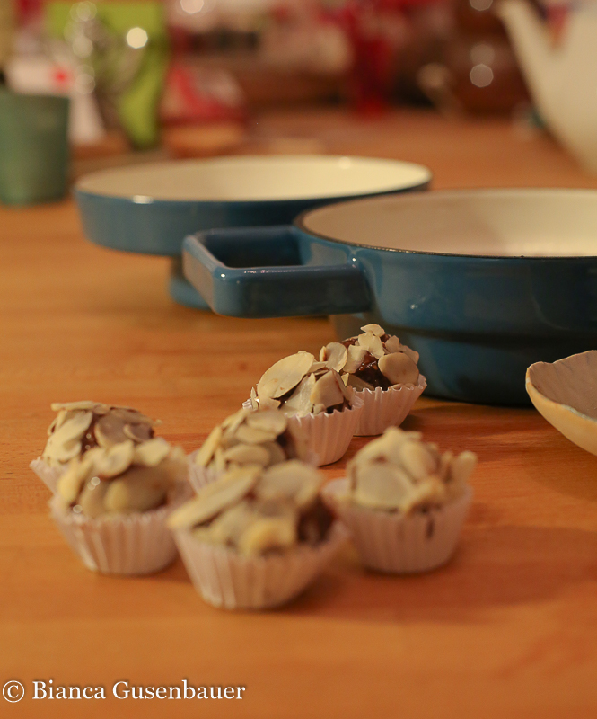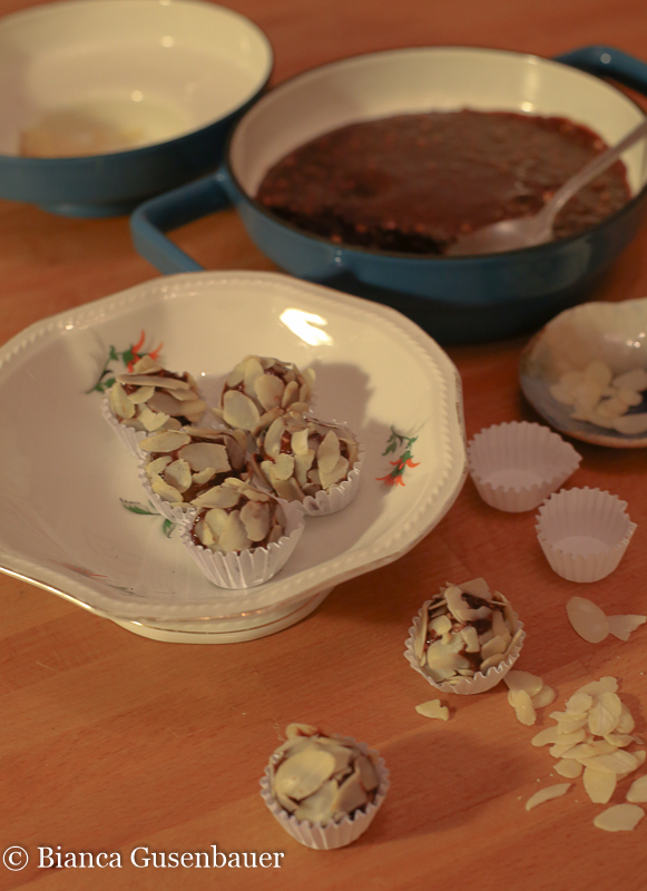 • Mit feuchten Händen aus der gekühlten Schokolademasse kleine Kugeln formen und in gehobelten Mandeln wälzen.