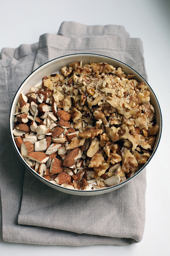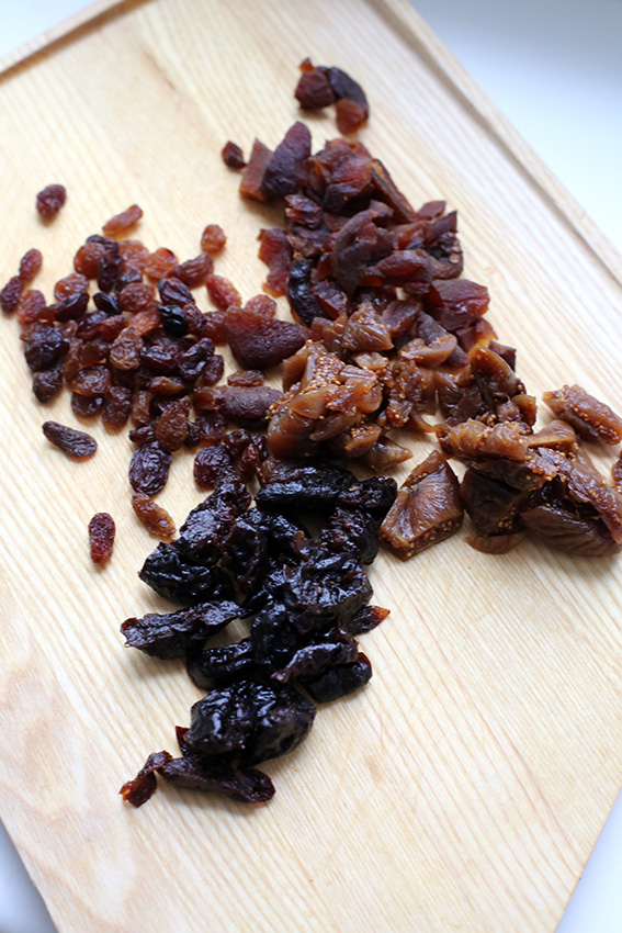 • Nüsse und Früchte grob hacken und unter den Teig mischen.