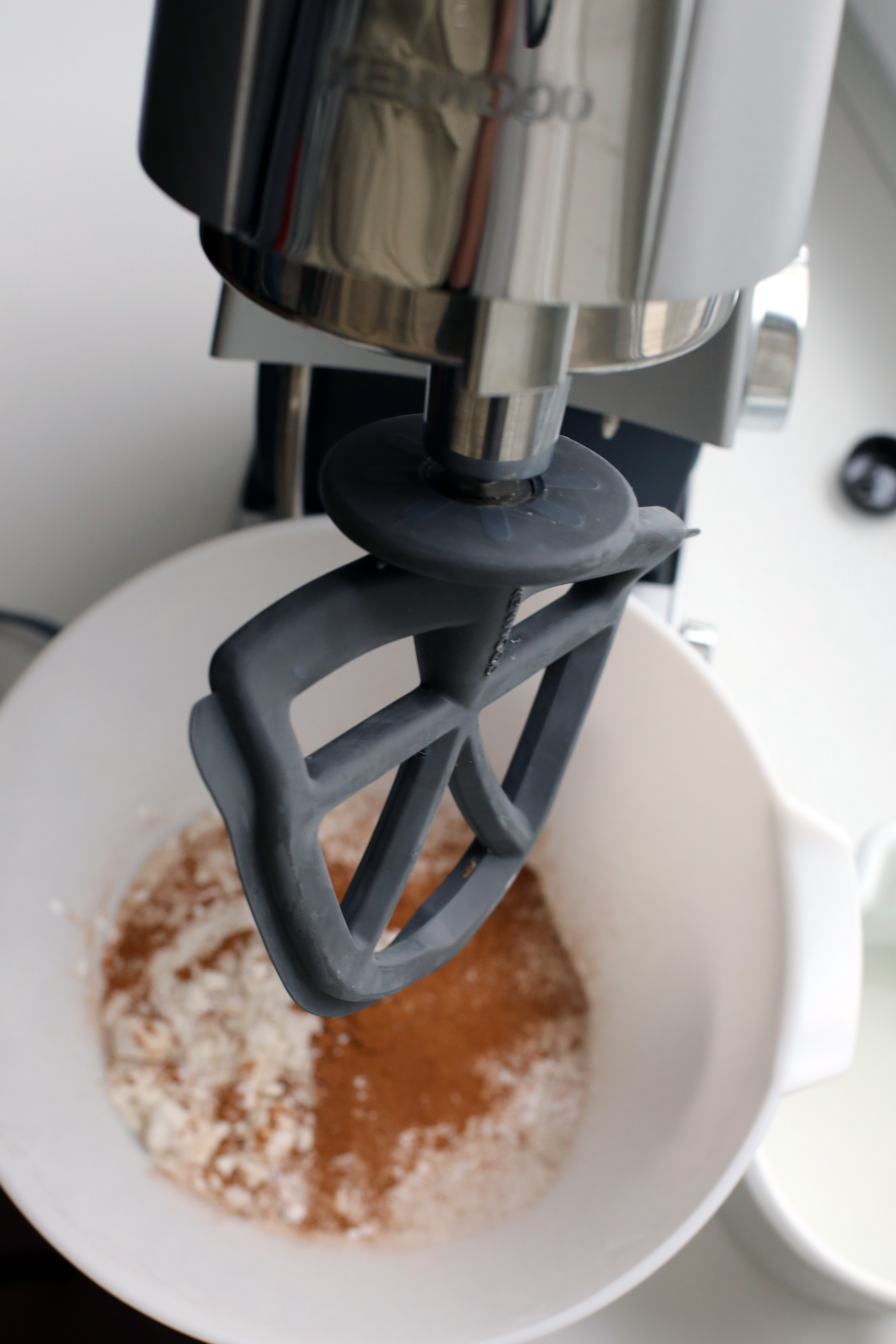 • Die beiden Mehlsorten mit Backpulver in einer Schüssel vermischen und mit Birnendicksaft, Reismilch sowie Zimt und Nelken mit einem Mixer zu einem glatten Teig verkneten.