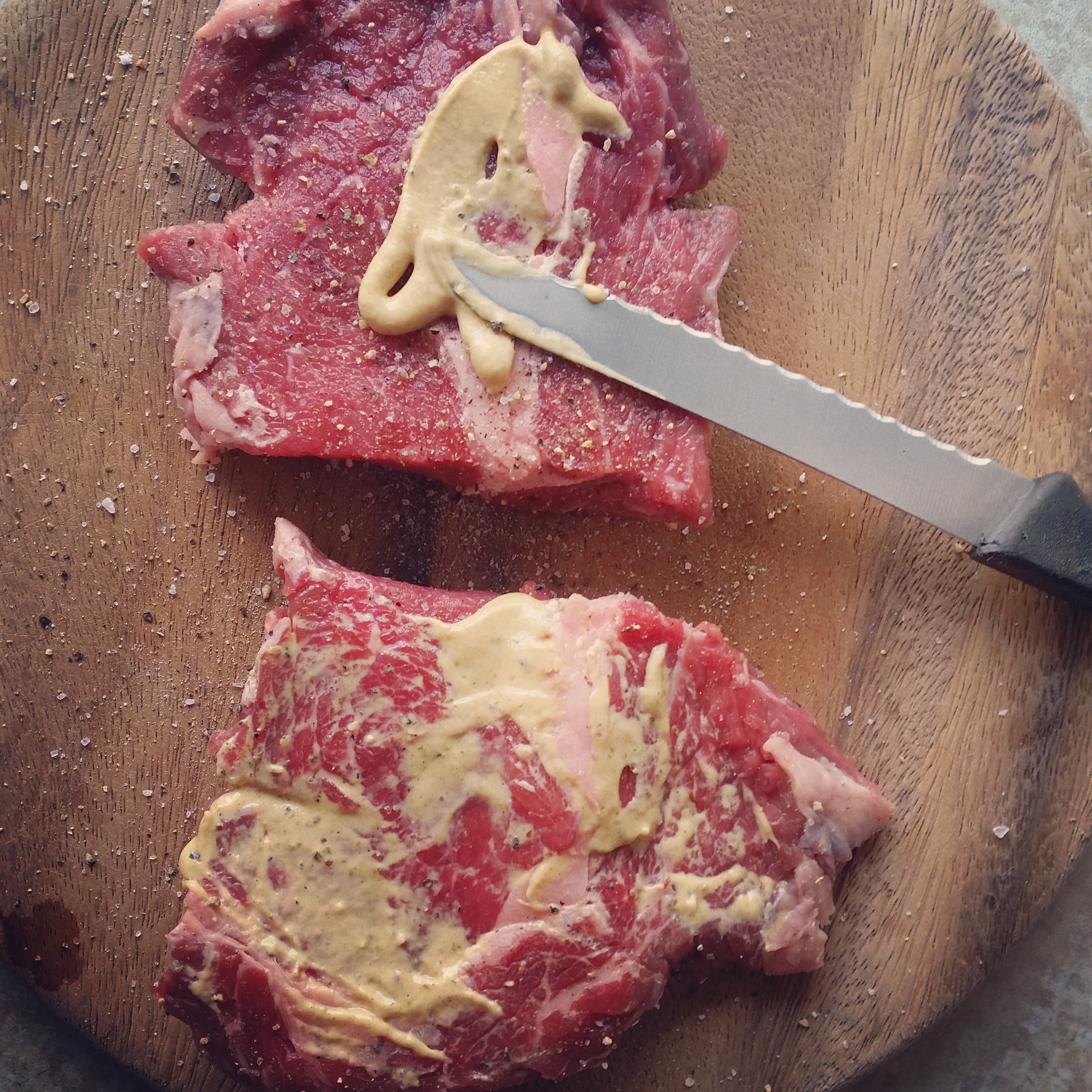 - Für den Rostbraten geschälte Zwiebeln in feine Ringe schneiden. Rostbraten etwas klopfen und die Ränder einschneiden. Salzen, pfeffern und auf einer Seite mit Senf bestreichen. Öl erhitzen und Fleisch mit der Senfseite nach unten einlegen, braun anbraten, wenden und aus der Pfanne auf ein Teller heben. Hälfte der Zwiebeln bräunen und mit 1 EL Mehl bestauben und durchrösten. Mit Suppe oder Wasser aufgießen, würzen und zugedeckt weichdünsten.
