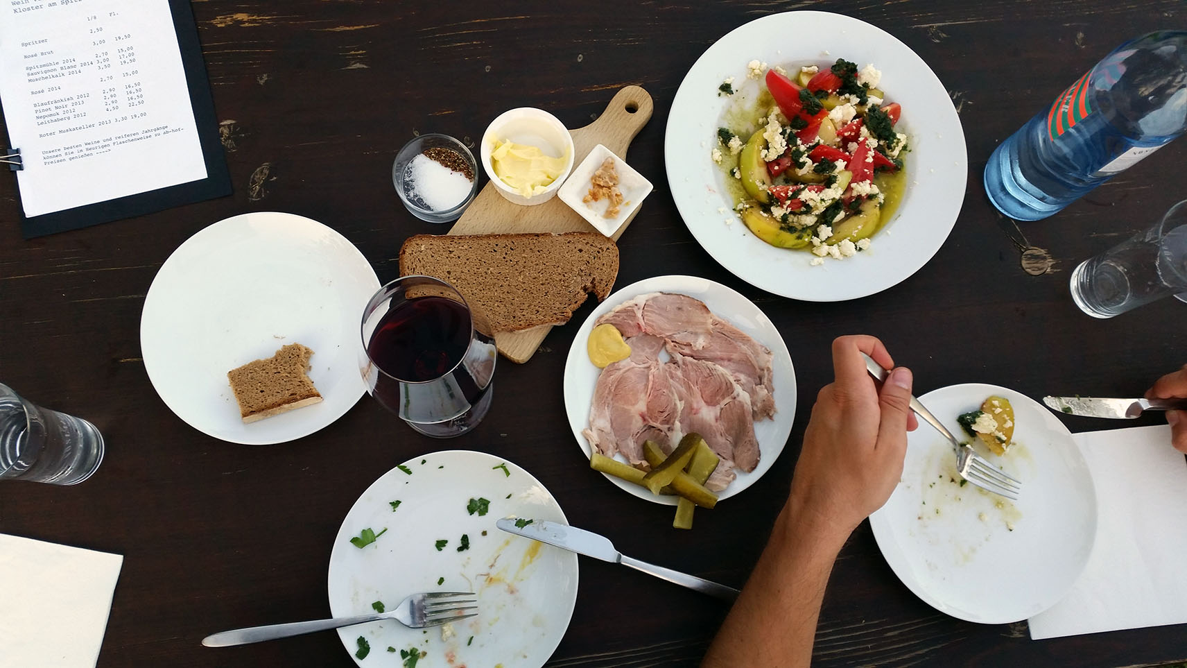 Eigentlich ist Schwein und Wein ein Art Freiluft-Deli, in der regionale Produkte auf einem schwärmerischen Niveau verkocht werden. Das Angebot ist überschaubar und weil uns dabei aber trotzdem die Auswahl schwer viel, haben wir einfach die Platte für 2 gewählt. Aber „Platte“ stimmt eigentlich auch nicht, denn man ißt sich quasi einmal rauf und runter in der Speisekarte.