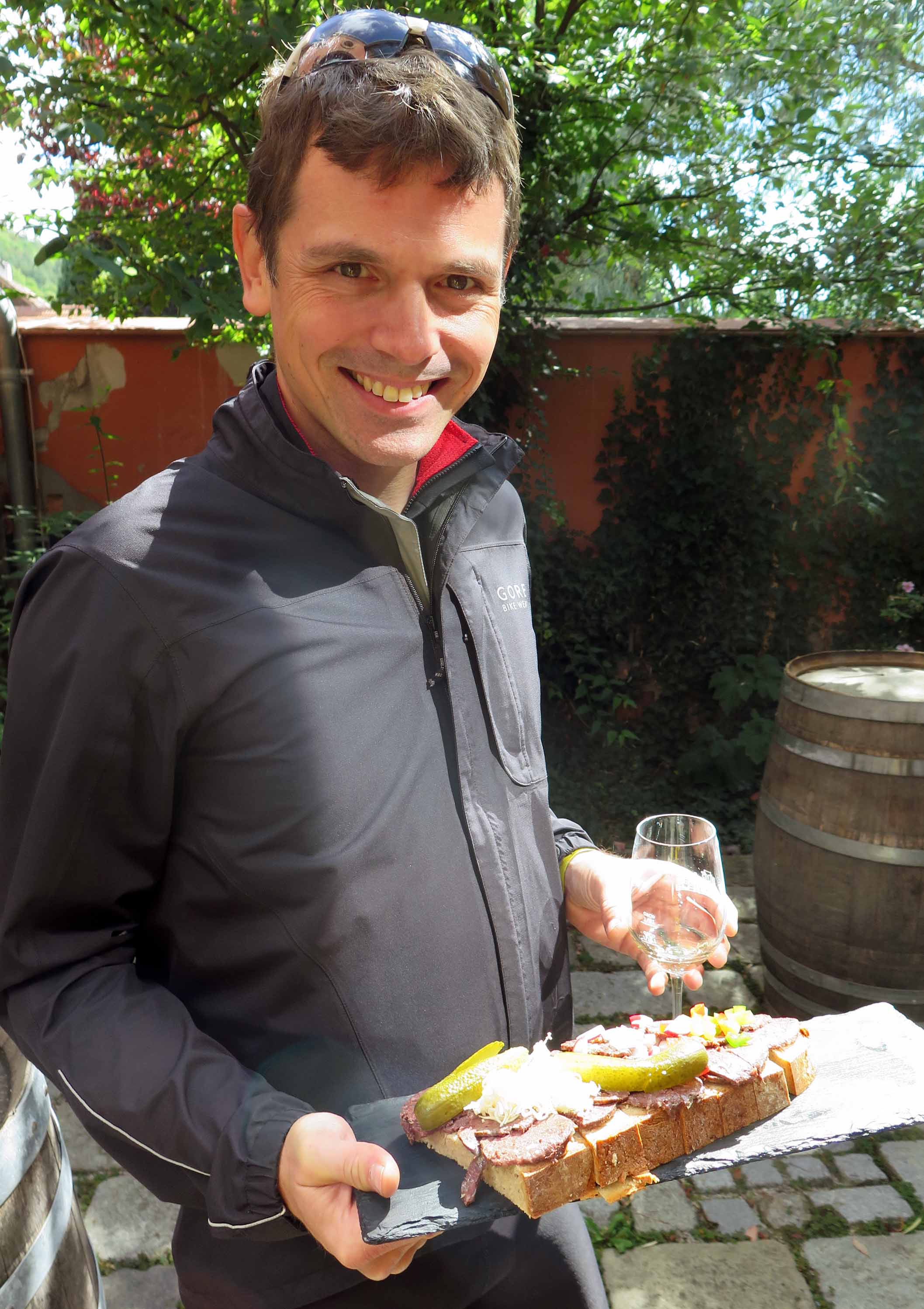 Heute meinte A. dann nochmals zu mir: „Eigentlich wäre ich da gerne noch länger geblieben.“ Aber die Zeit war knapp und die Kellertüren nur bis 18 Uhr offen, daher konnten wir zwar den köstlichen Verjus, ein paar Weißweine, die Pestos vom Gemahl und auch den saftigen Kuchen von der Mama probieren, wären aber eigentlich gerne viel länger geblieben.