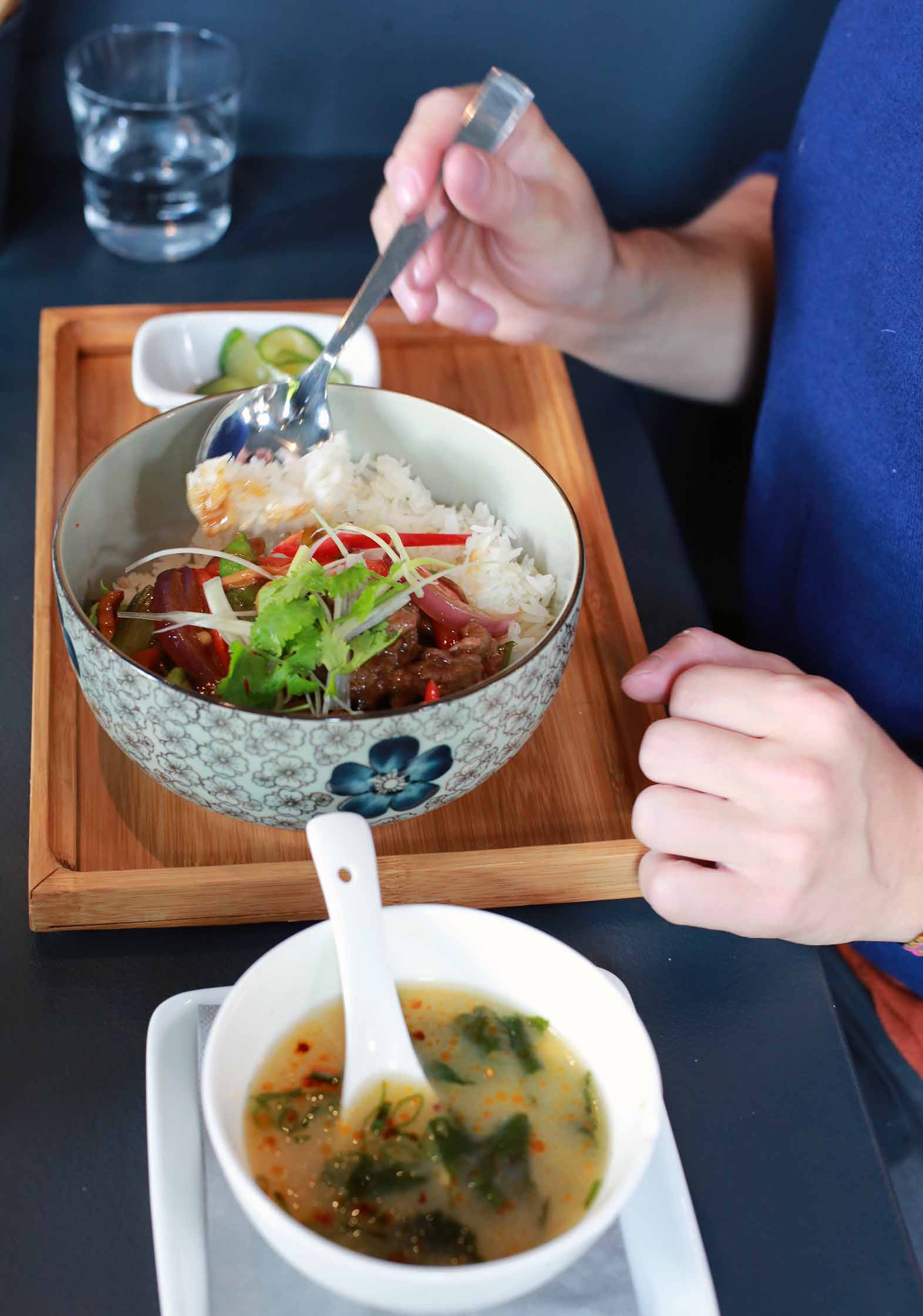 Wahrlich ein feuriger Suppenkaspar muss man sein, damit man diese Mittagskarte genießen kann. Denn auch die Vorspeisen-Suppe, eine Miso-Suppe, ist leicht feurig. Scharf, schärfer, noch schärfer, am schärfesten ist also die vierte Steigerungsstufe die Simon Xie Hong eben für sein viertes Lokal ausgewählt hat. Denn neben allen Speisen ist auf der Speisekarte „scharf“ angemerkt und der Untertitel des Lokals lautet „HOT KITCHEN“.