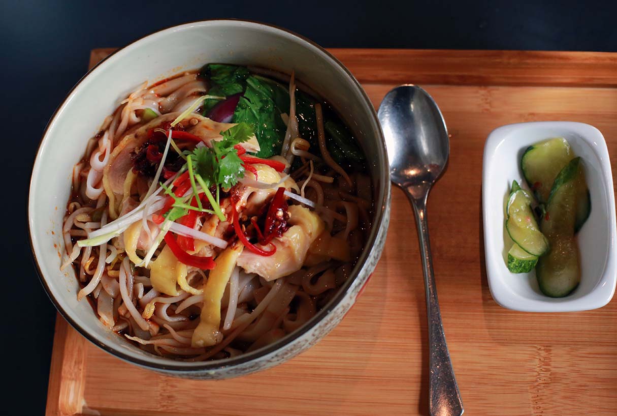 Die Gerichte sind gut gewürtzt, zwar scharf, aber nicht überschärft. Ferdinand hat sich für Rindfleisch mit Reis entschieden und war sehr zufrieden. Ich hatte Lust auf Nudeln und habe daher das Maishänhchen „Dou“ Chilli mit Nudeln gewählt, das eben auch in einem aromatischen Süppchen serviert wurde. Herrlich zart das Fleisch und passend zu den Nudeln, machte dieser Mittagstisch richtig Lust auf mehr.