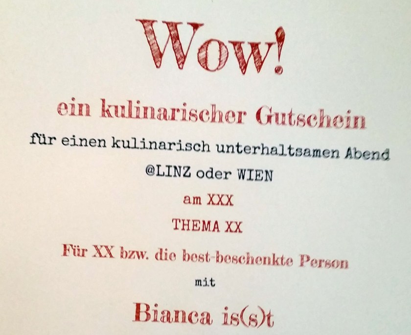 Was soll man bloß schenken? Wenn eh alle immer schon alles haben bzw. sich selber quasi alles kaufen können. Ja, nur an der gemeinsamen Zeit happert es oft. Daher werfe ich mich auch dieses Jahr ins Rennen für die beste genussvolle Geschenkszeit! Jipiii. Mehr zu meinem grandiosen Angebot gibt es auf meiner sexy neuen Homepage Bianca is(s)t! 😉 Gutscheine und Kochkurs-Termine können bis in letzter Minute gebucht werden, falls es zeitlich knapp werden sollte. Ho, ho, ho…